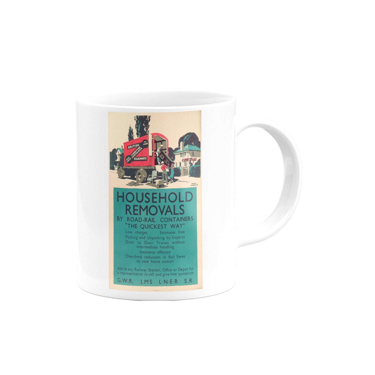 Your favourite Vintage Railway Poster design on a mug. This design of Household Removals By Road-Rail Containers, "The Quickest Way", GWR, LMS, LNER, SR is perfect for a nice cup of tea or coffee. Great as a gift to any Railway Poster enthusiast.