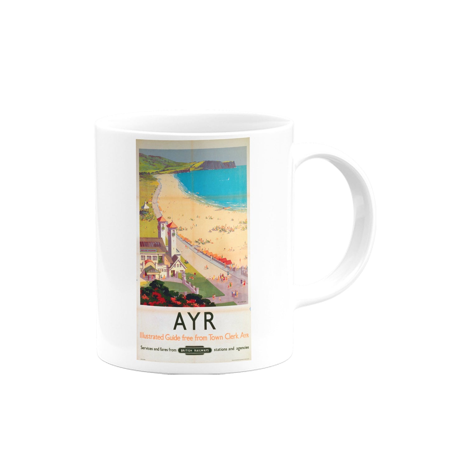 Your favourite Vintage Railway Poster design on a mug. This design of Ayr, Illustraded Guide free from Town Clerk Ayr, British Railways is perfect for a nice cup of tea or coffee. Great as a gift to any Railway Poster enthusiast.