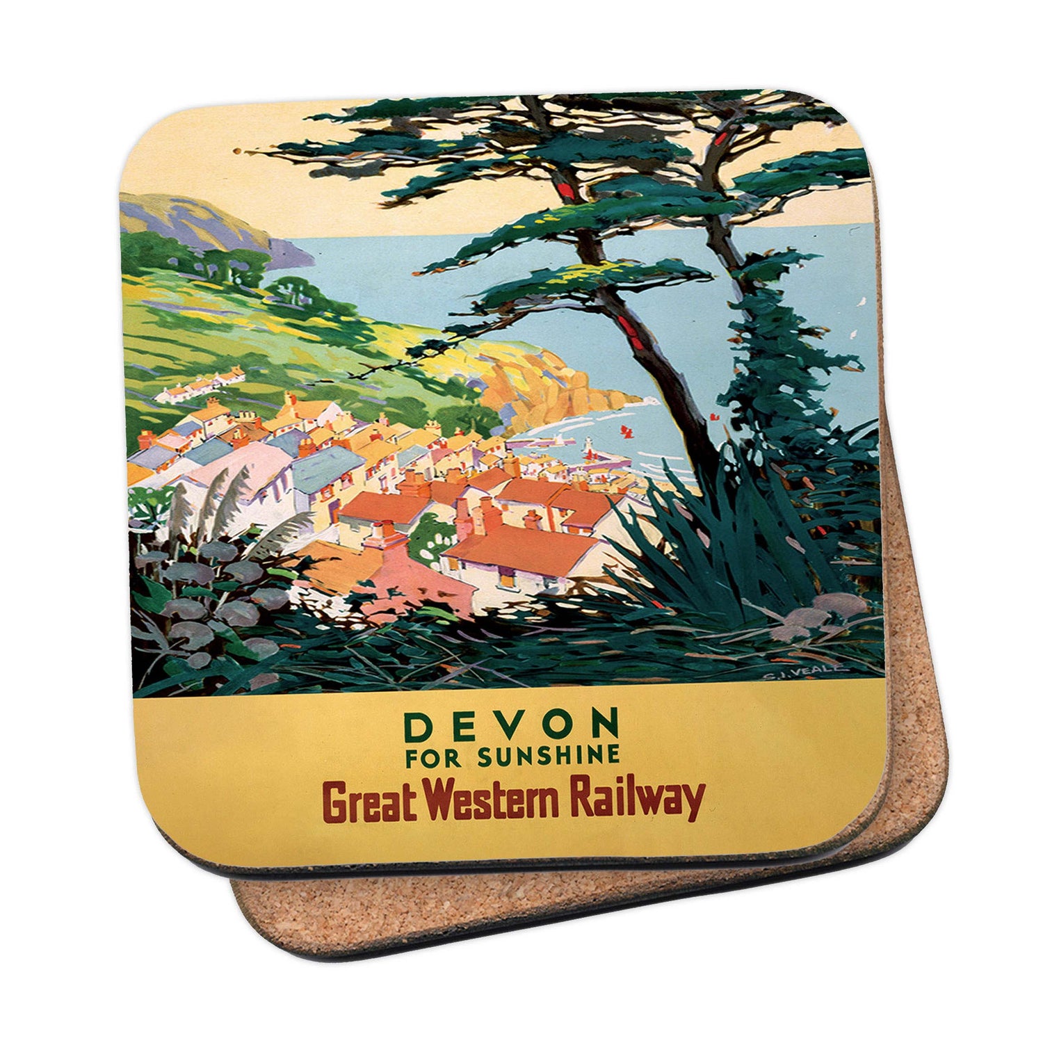 Protect your table surfaces with these durable cork coasters. Beautiful design of Devon for Sunshine. Perfect for any Railway Posters enthusiast.