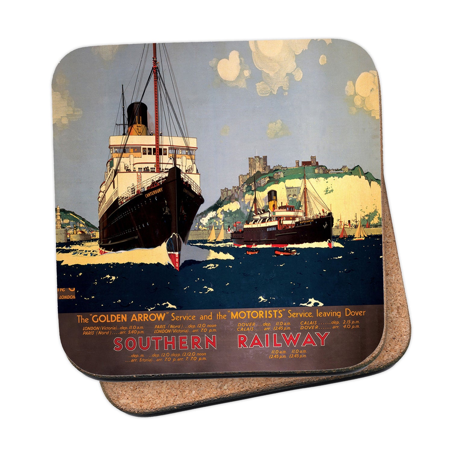 Protect your table surfaces with these durable cork coasters. Beautiful design of Southern Railway Ships, The Golden Arrow and the Motorists. Perfect for any Railway Posters enthusiast.