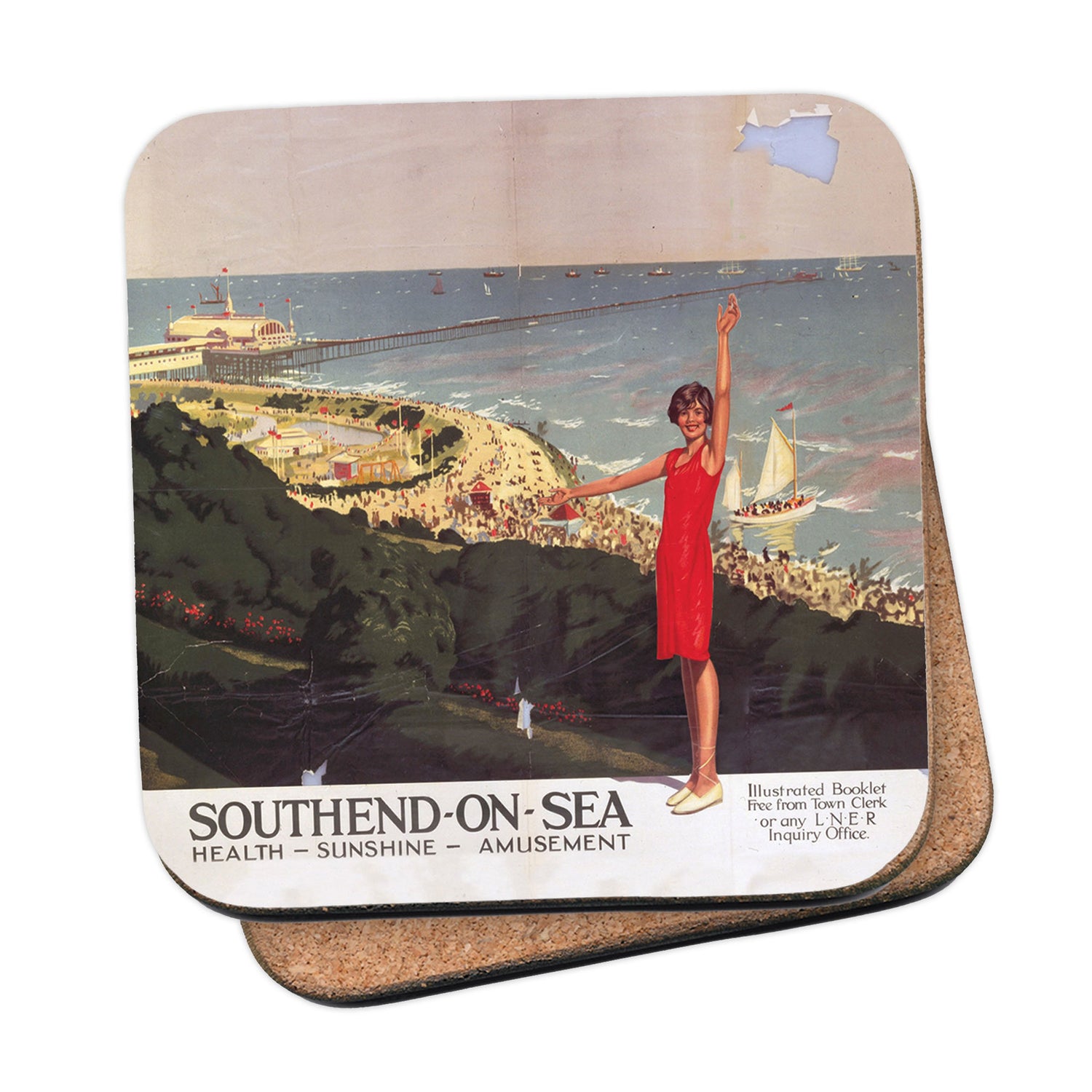 Protect your table surfaces with these durable cork coasters. Beautiful design of Southend on Sea Health Sunshine Amusement. Perfect for any Railway Posters enthusiast.