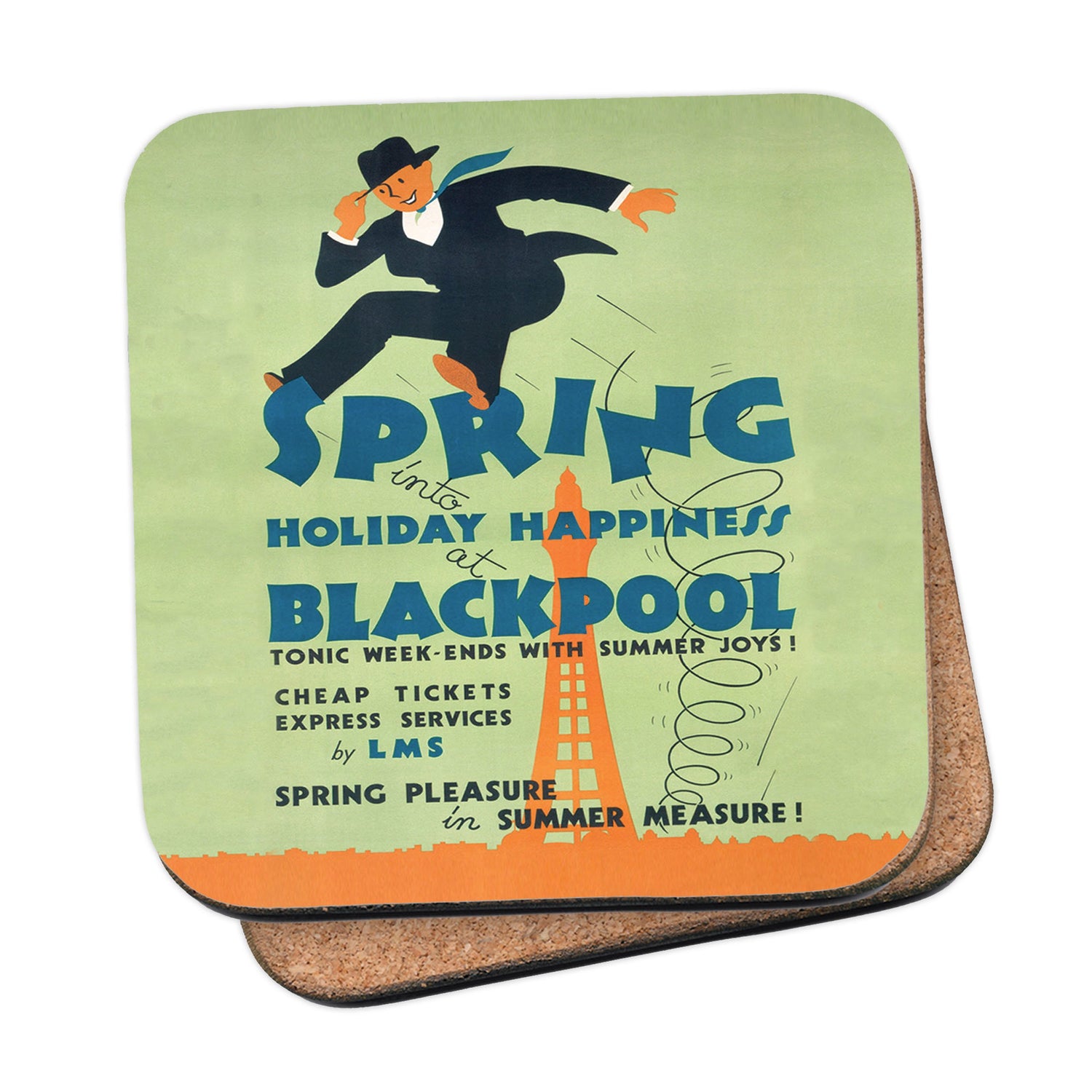 Protect your table surfaces with these durable cork coasters. Beautiful design of Blackpool, Holiday Happiness. Perfect for any Railway Posters enthusiast.
