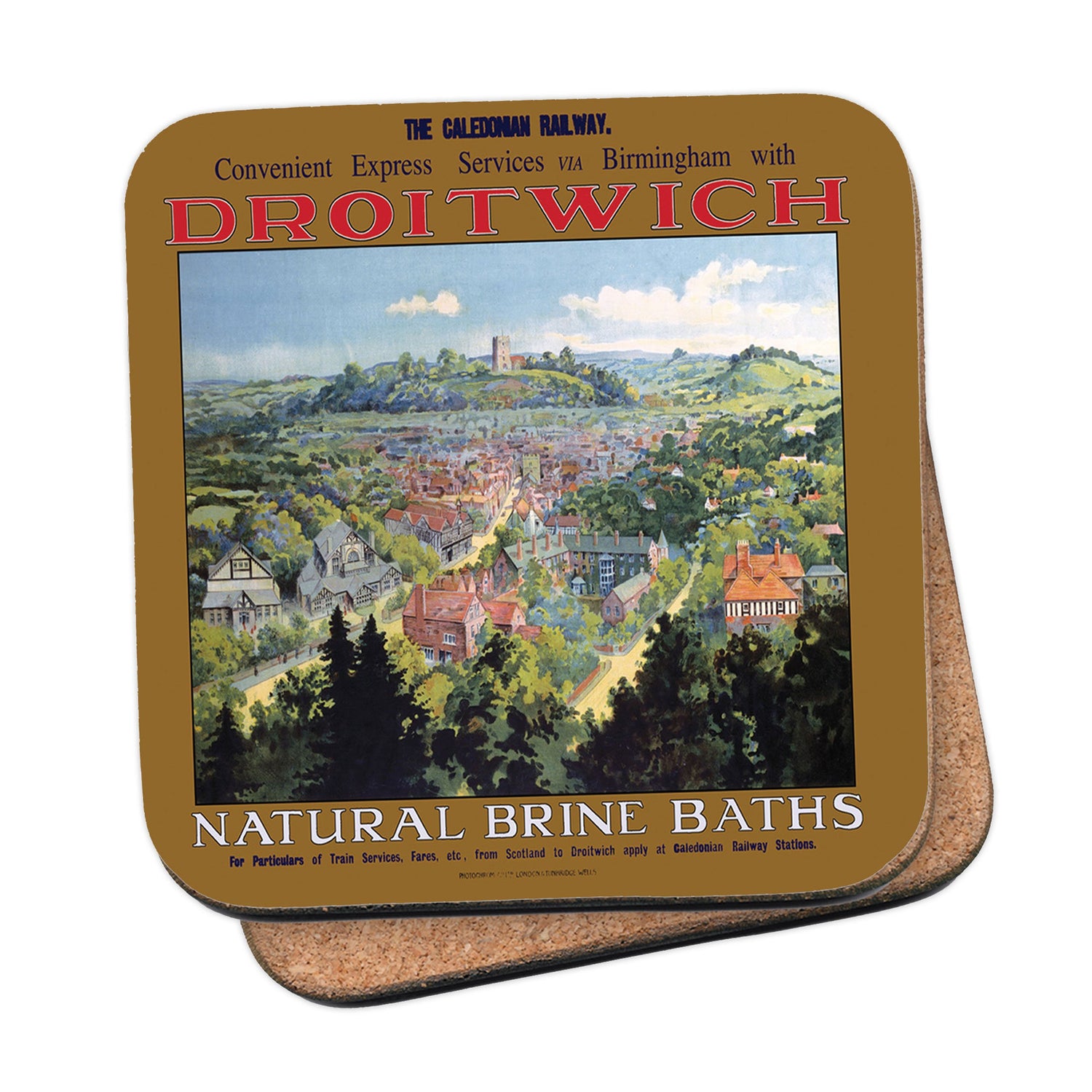 Protect your table surfaces with these durable cork coasters. Beautiful design of Droitwich, Natural Brine Baths. Perfect for any Railway Posters enthusiast.