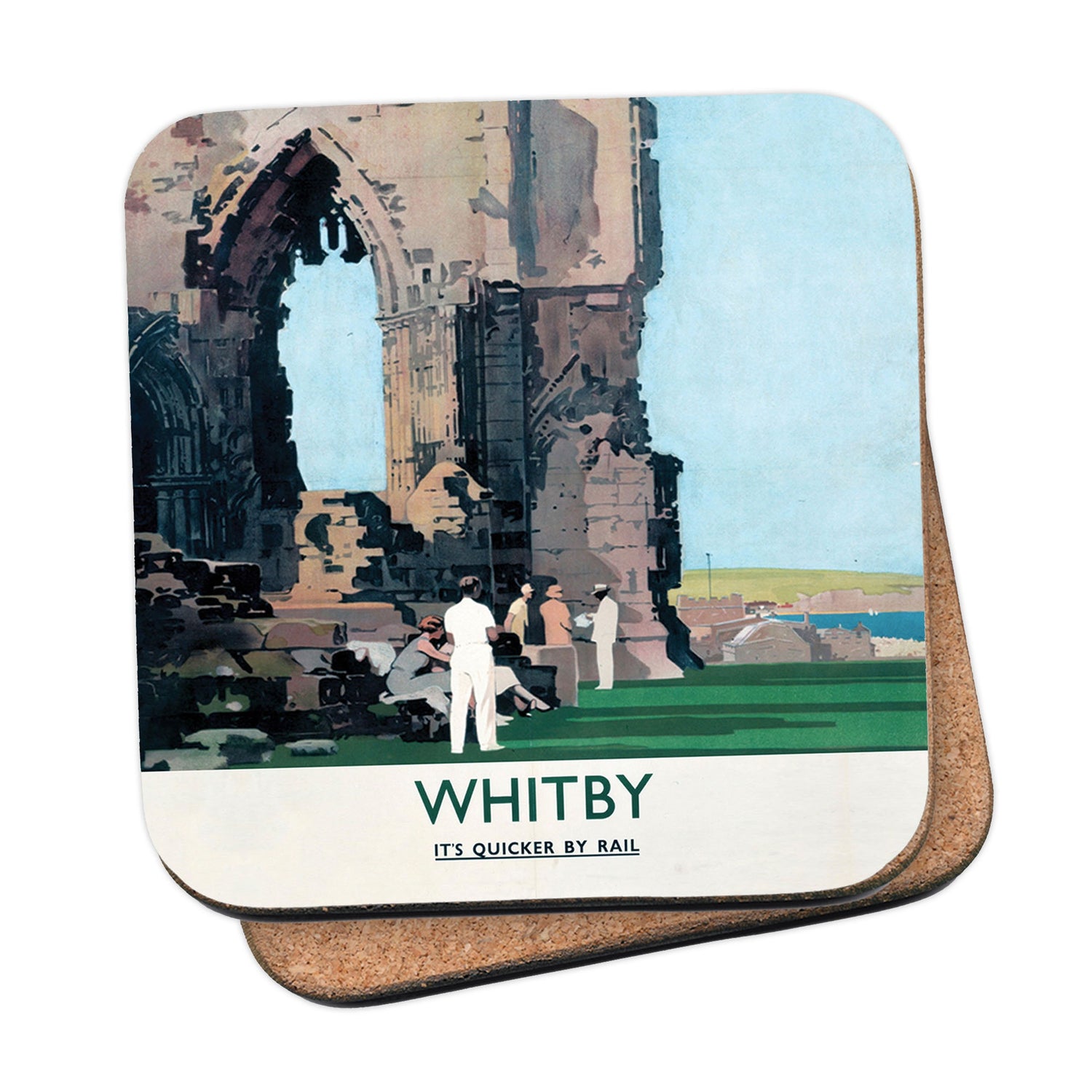 Protect your table surfaces with these durable cork coasters. Beautiful design of Whitby. Perfect for any Railway Posters enthusiast.