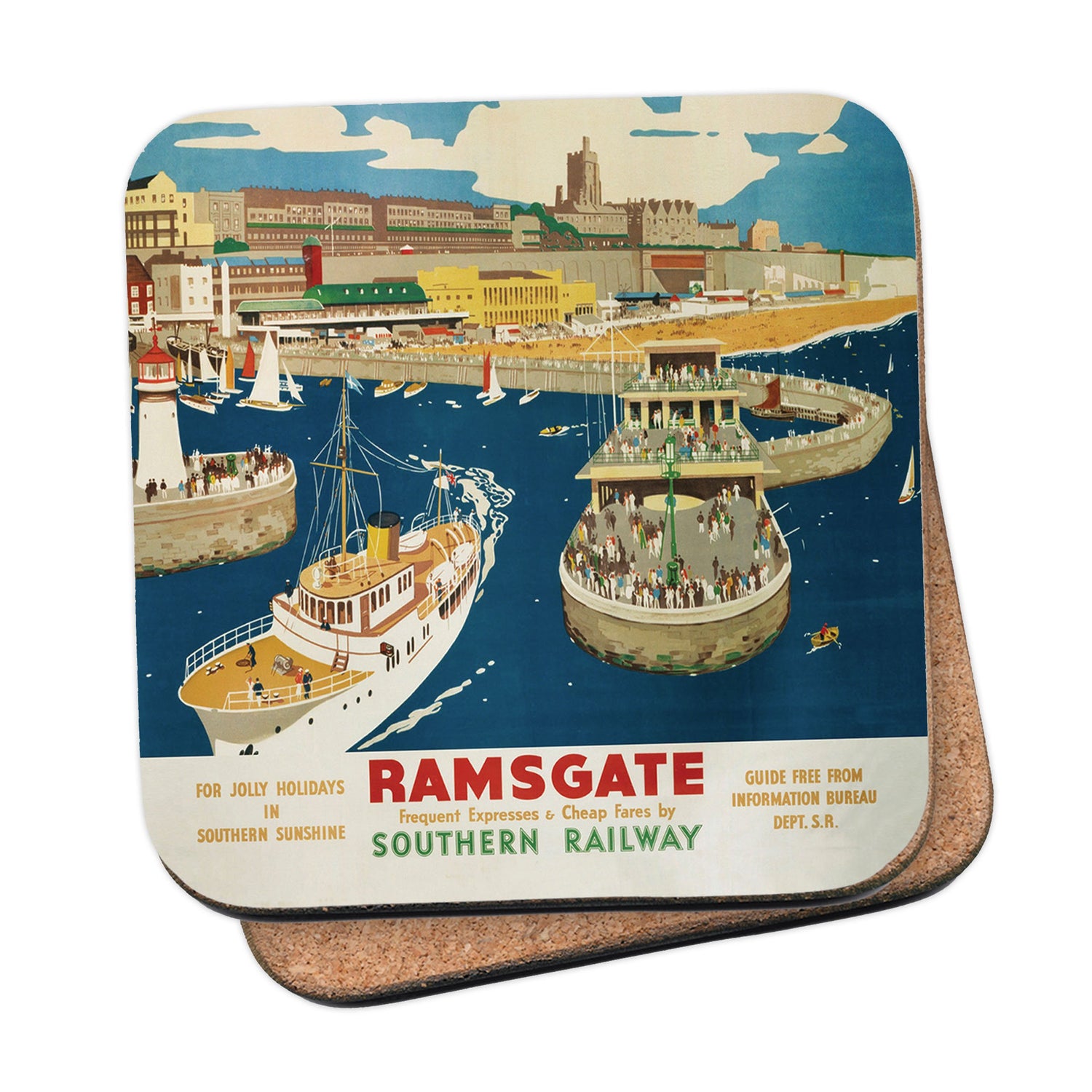 Protect your table surfaces with these durable cork coasters. Beautiful design of Ramsgate, for Jolly Holidays. Perfect for any Railway Posters enthusiast.