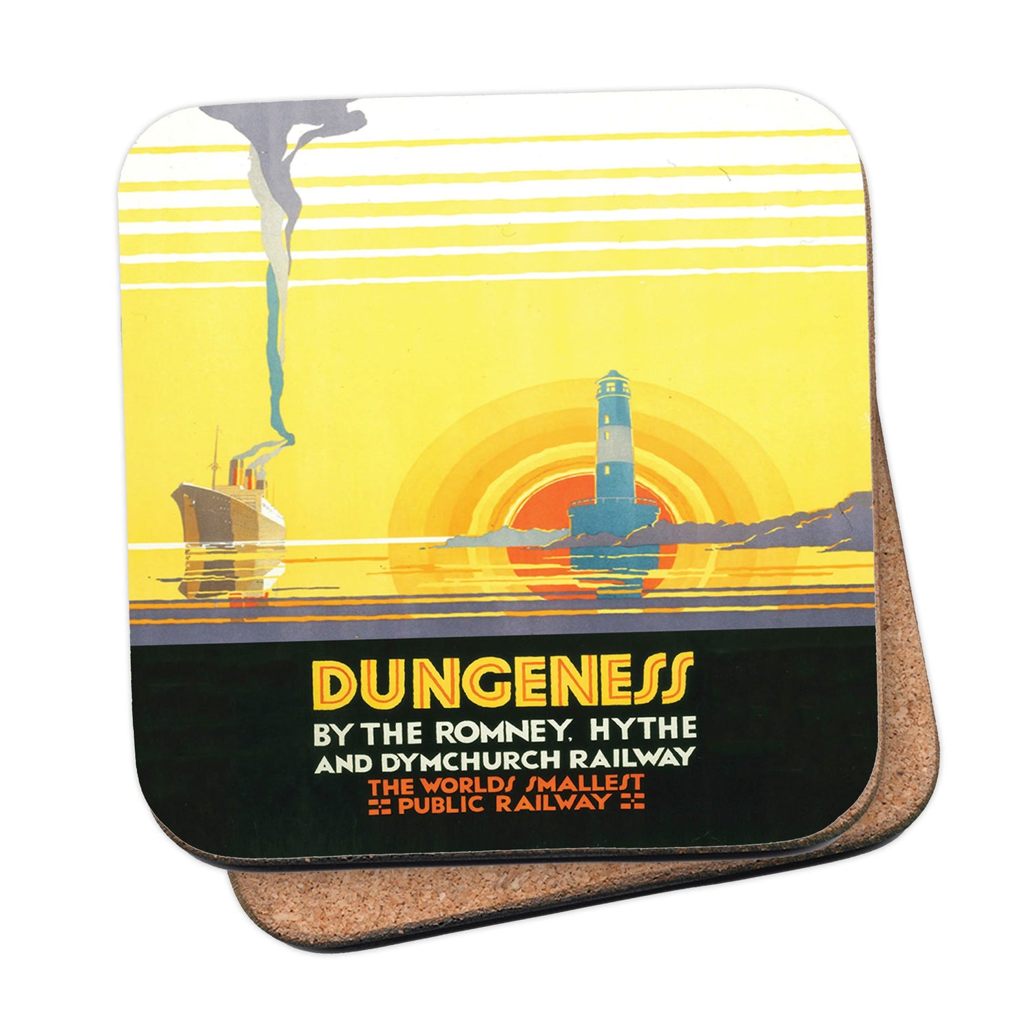 Protect your table surfaces with these durable cork coasters. Beautiful design of Dungeness by the Romney. Perfect for any Railway Posters enthusiast.