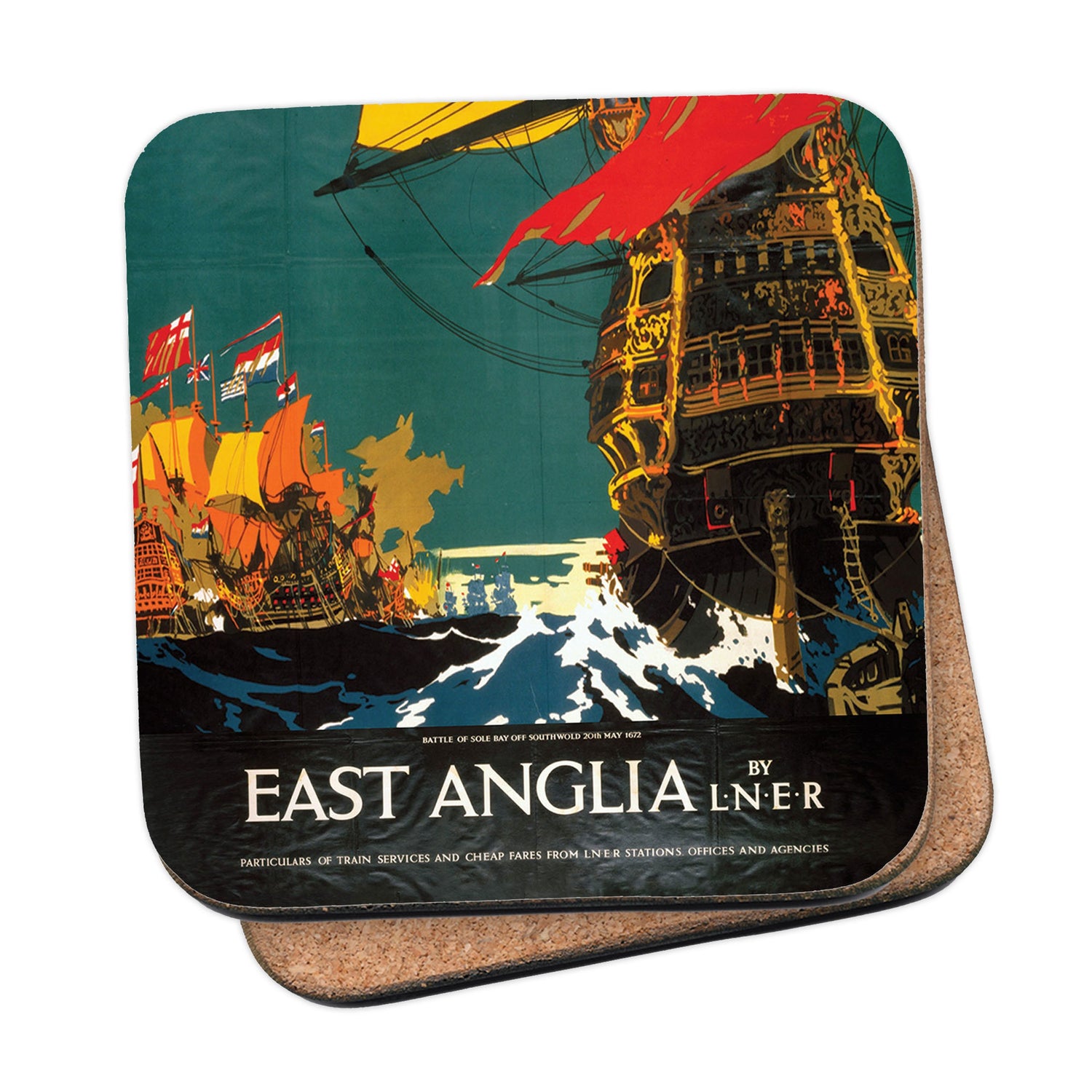 Protect your table surfaces with these durable cork coasters. Beautiful design of East Anglia - Battle of Sole Bay off Southwold. Perfect for any Railway Posters enthusiast.