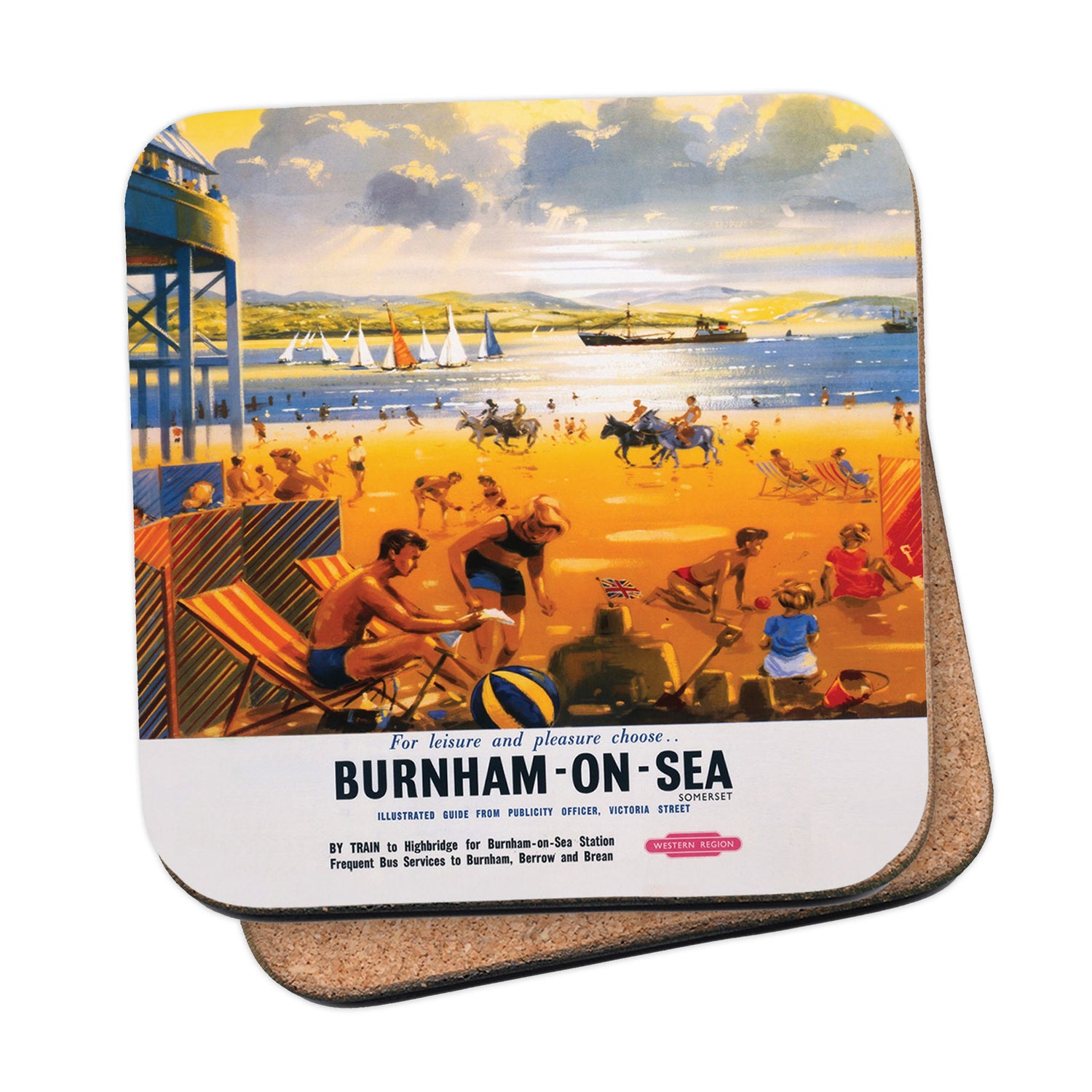 Protect your table surfaces with these durable cork coasters. Beautiful design of Burnham-on-Sea for Leisure and Pleasure. Perfect for any Railway Posters enthusiast.