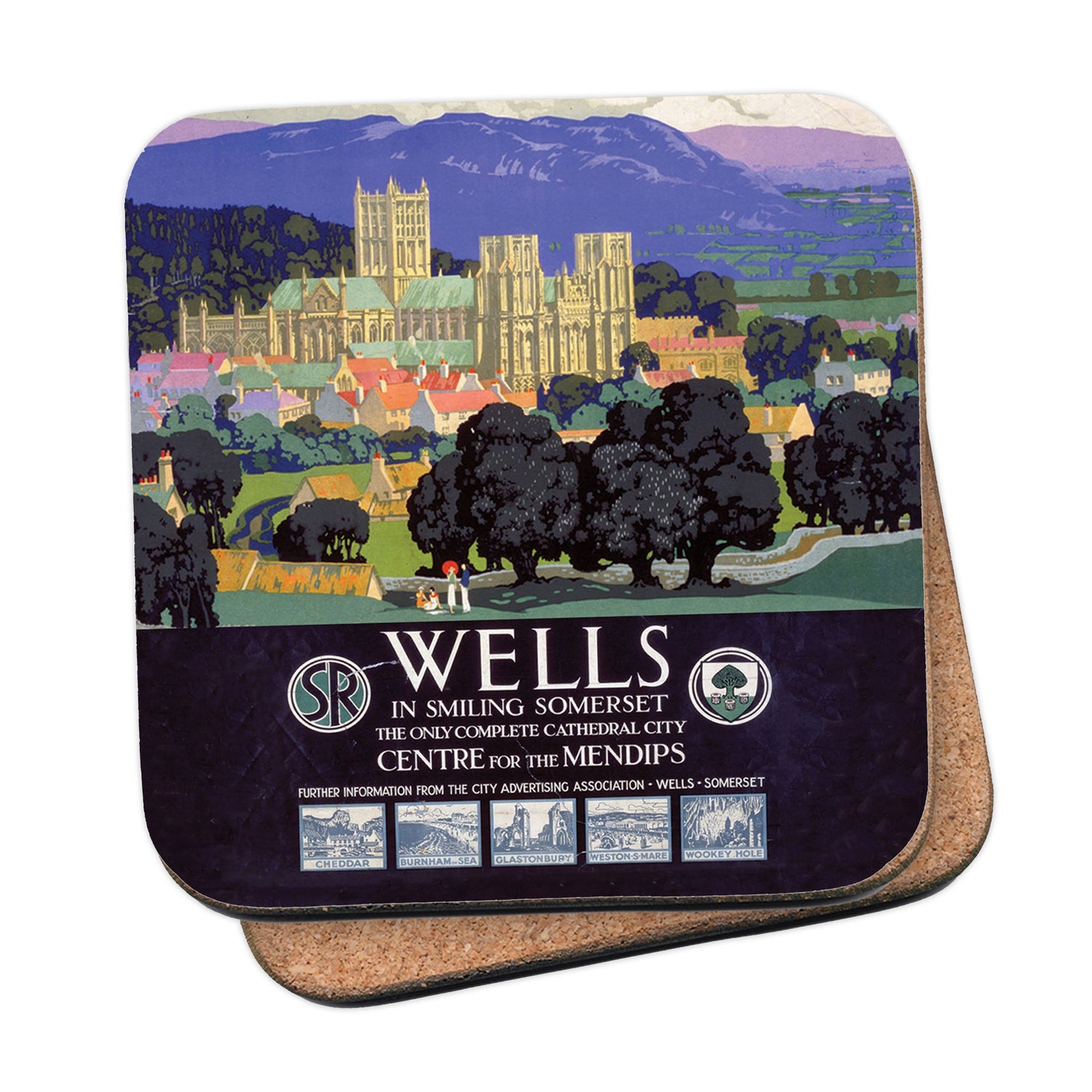 Protect your table surfaces with these durable cork coasters. Beautiful design of Wells in Smiling Somerset. Perfect for any Railway Posters enthusiast.