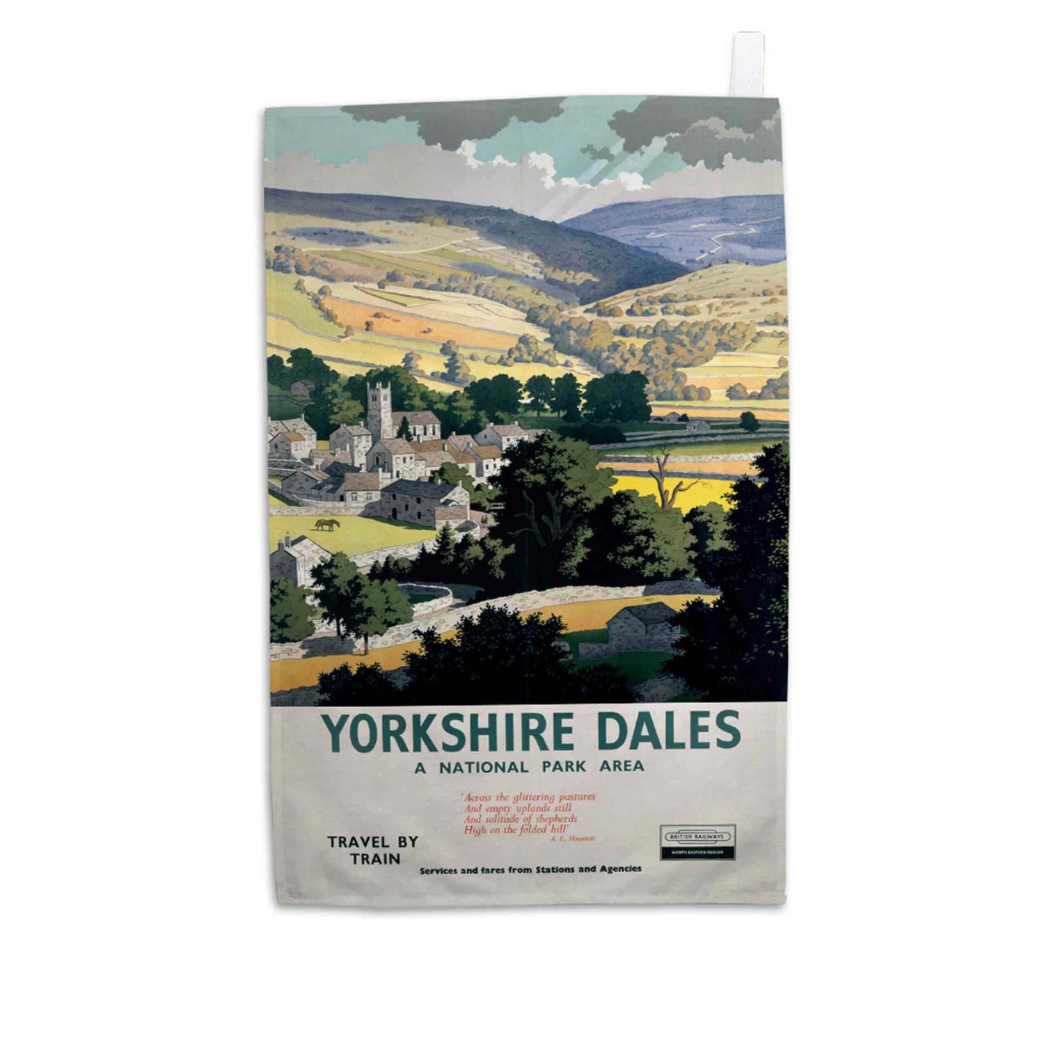 Classic Railway Poster Design on high-quality Tea Towel. This vintage rail design of Yorkshire Dales - National Park Area will look great in any kitchen. All made from 100% cotton and hemmed on all four sides along with a handy hanging loop.