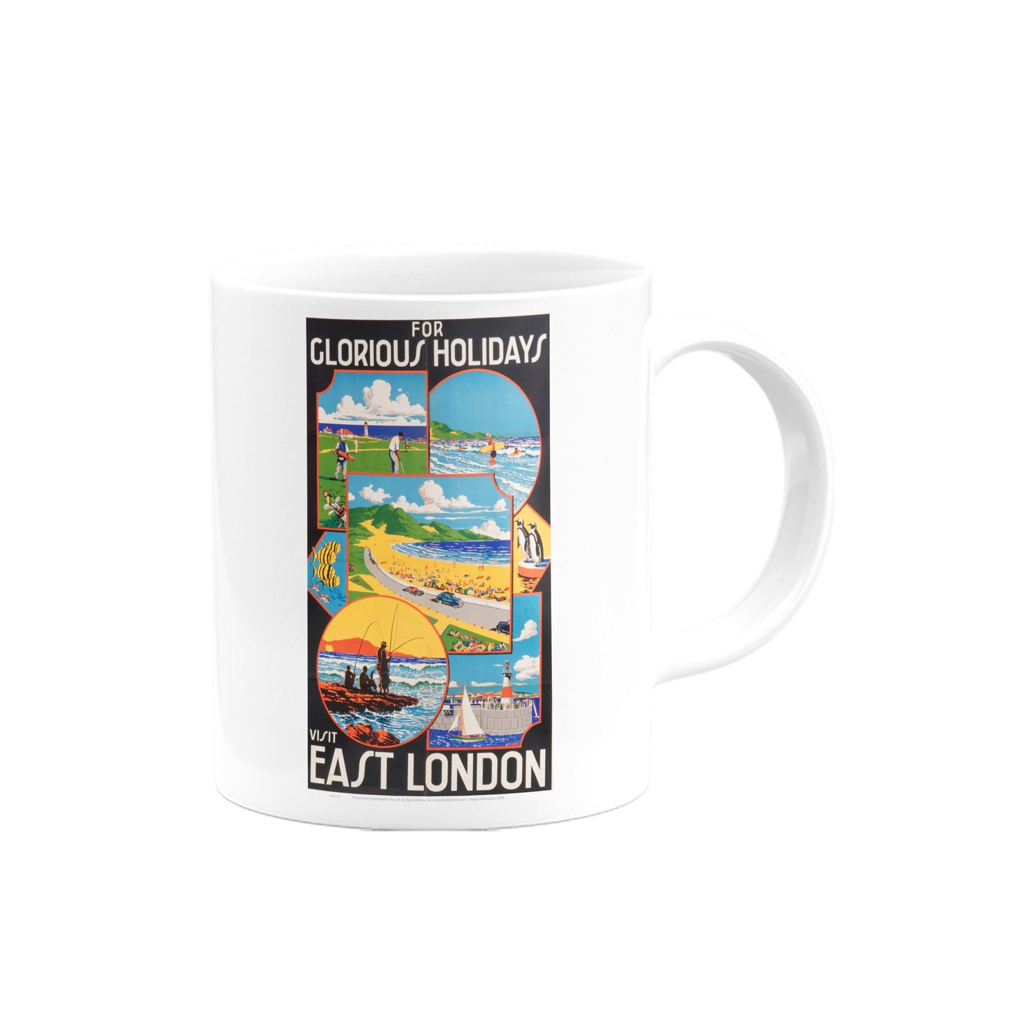 Your favourite Vintage Railway Poster design on a mug. This design of for Glorious Holidays Visit East London is perfect for a nice cup of tea or coffee. Great as a gift to any Railway Poster enthusiast.
