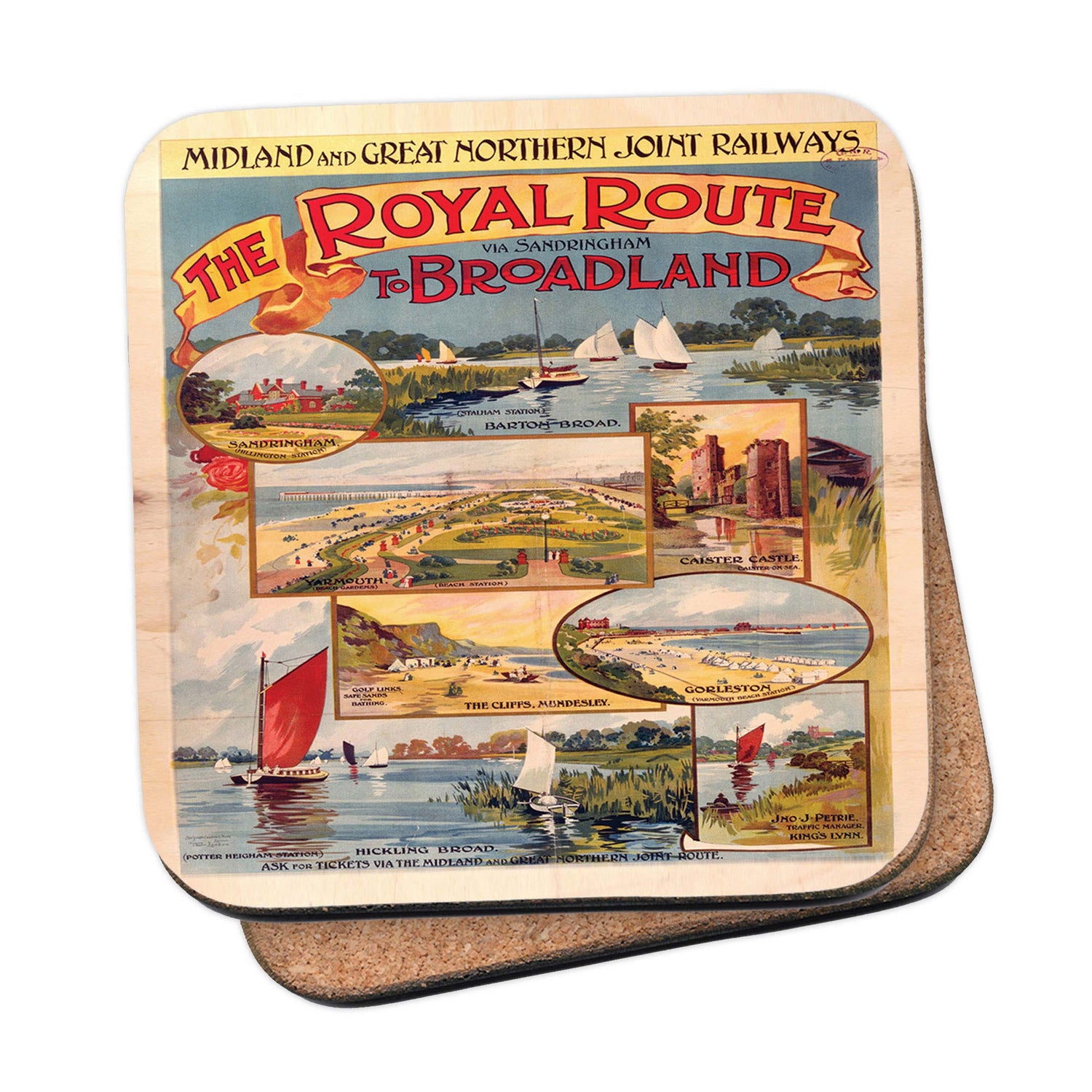 Protect your table surfaces with these durable cork coasters. Beautiful design of The Royal Route via Sandringham to Broadland. Perfect for any Railway Posters enthusiast.
