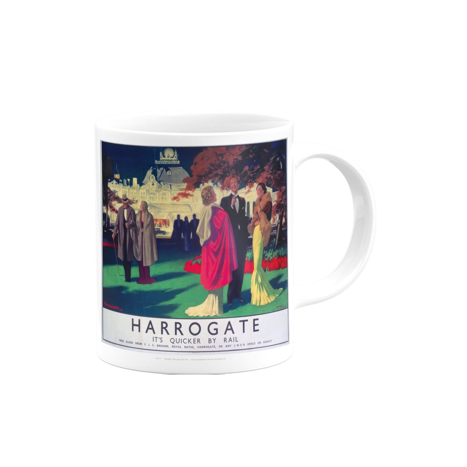 Your favourite Vintage Railway Poster design on a mug. This design of Harrogate, It's Quicker By Rail is perfect for a nice cup of tea or coffee. Great as a gift to any Railway Poster enthusiast.