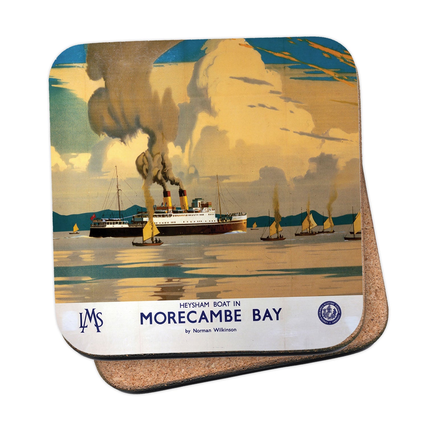 Protect your table surfaces with these durable cork coasters. Beautiful design of Morecambe Bay - Heysham Boat. Perfect for any Railway Posters enthusiast.