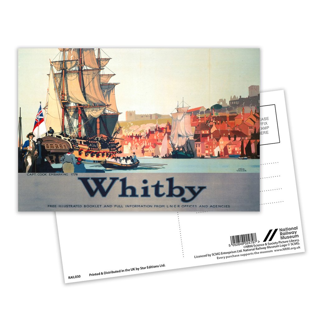 This Vintage Railway Poster postcard pack contains eight postcards. Each printed with the classic poster design of Whitby - Capt Cook Embarking 1776. All Railway Poster postcards are made from sustainable materials and is FSC accredited.