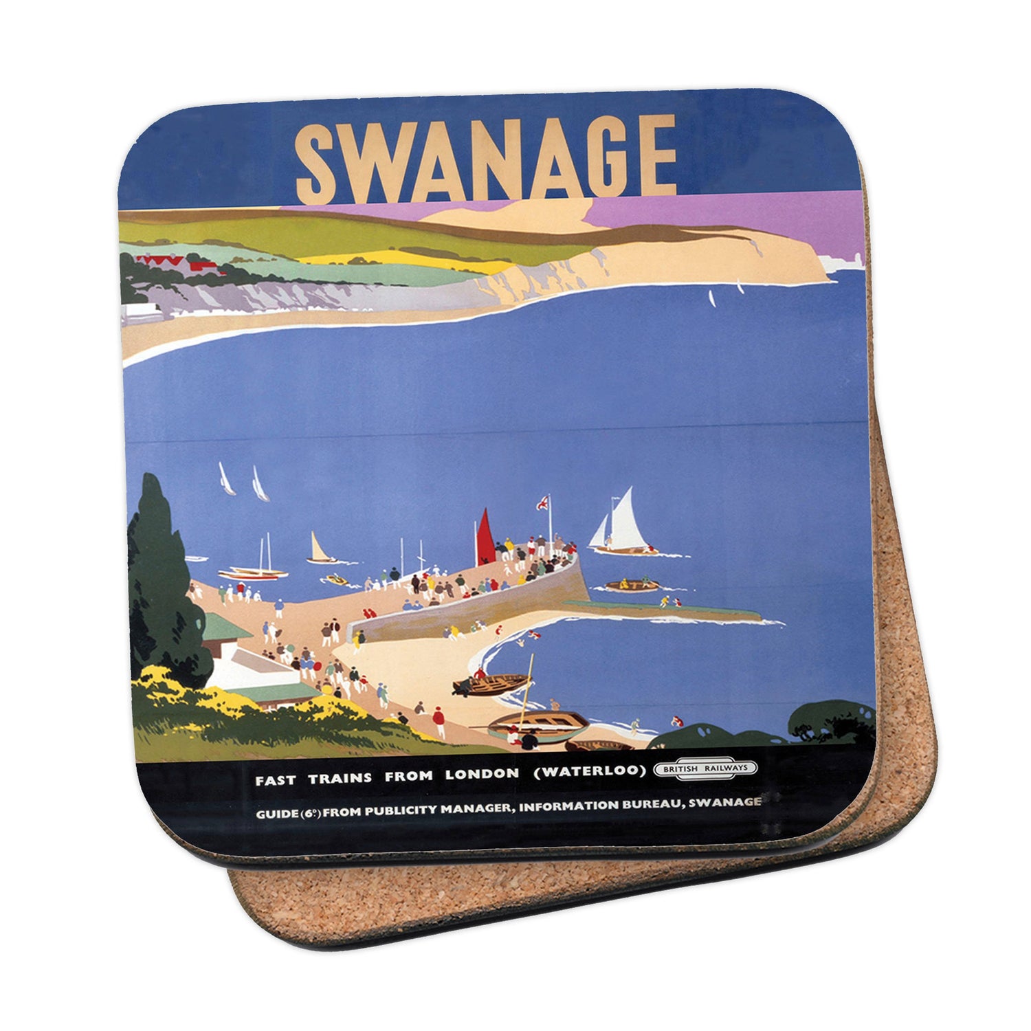 Protect your table surfaces with these durable cork coasters. Beautiful design of Swanage from London. Perfect for any Railway Posters enthusiast.