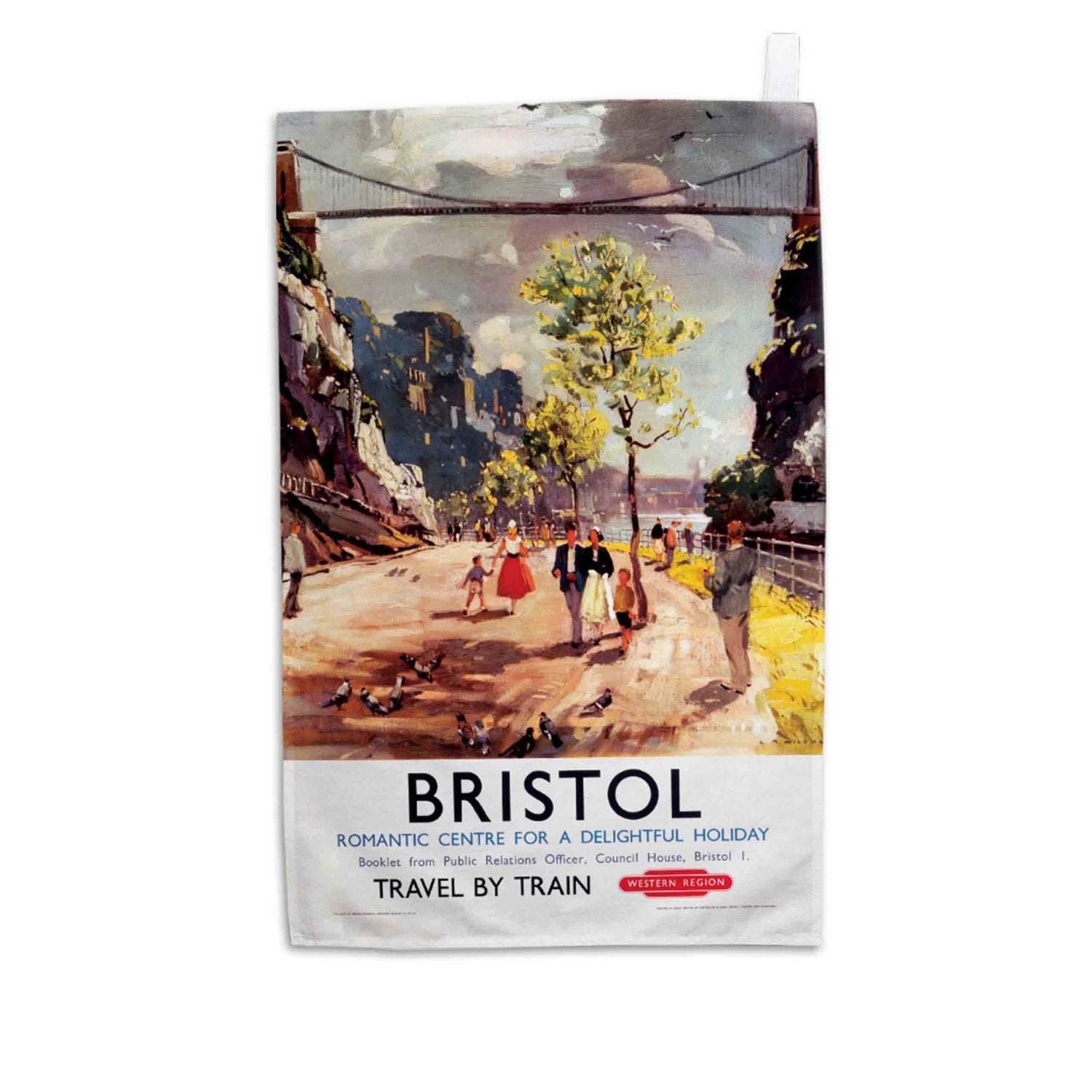 Classic Railway Poster Design on high-quality Tea Towel. This vintage rail design of Bristol, Romantic Centre will look great in any kitchen. All made from 100% cotton and hemmed on all four sides along with a handy hanging loop.