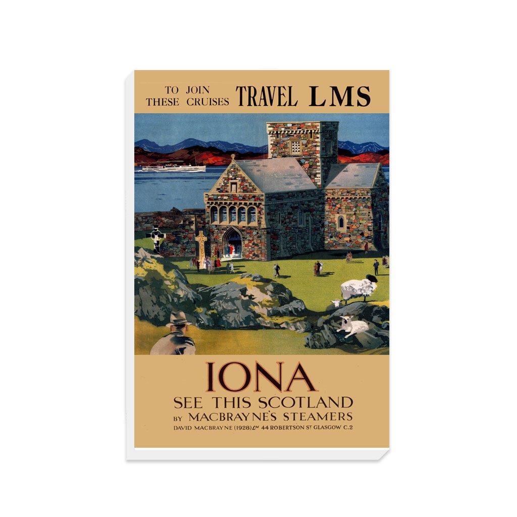 Vintage Railway Poster Canvas Wall Art of Iona - see this Scotland in Macbrayne's Steamers. Canvases are available in multiple sizes and are all made from eco-friendly FSC accredited materials. All Railway Poster Canvases are made of the best quality materials and are proudly printed in the UK