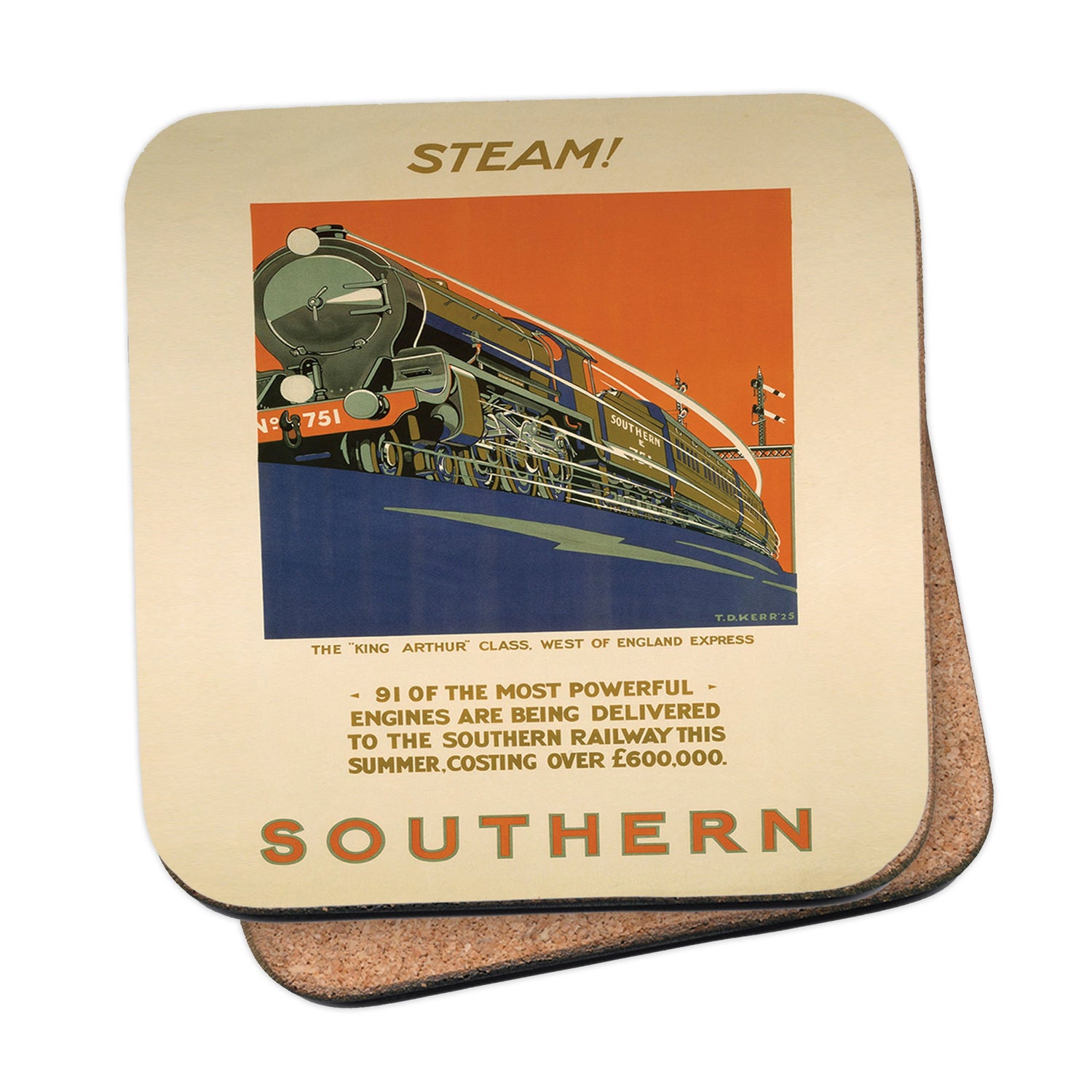 Protect your table surfaces with these durable cork coasters. Beautiful design of Steam! Southern Railway. Perfect for any Railway Posters enthusiast.