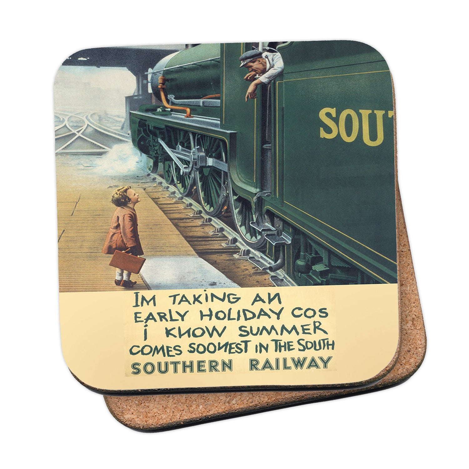 Protect your table surfaces with these durable cork coasters. Beautiful design of Summer Comes Soonest in the South - Southern Railway. Perfect for any Railway Posters enthusiast.