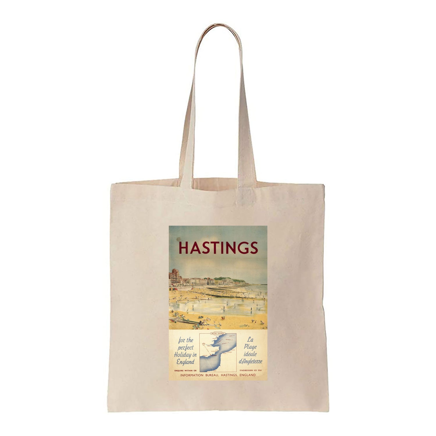 Railway Posters Design Tote Shopping Bag. Printed with Hastings - Perfect Holiday in England design. Perfect to take shopping or to carry things wherever you go. This environmentally friendly tote bag is the perfect replacement to plastic bags.