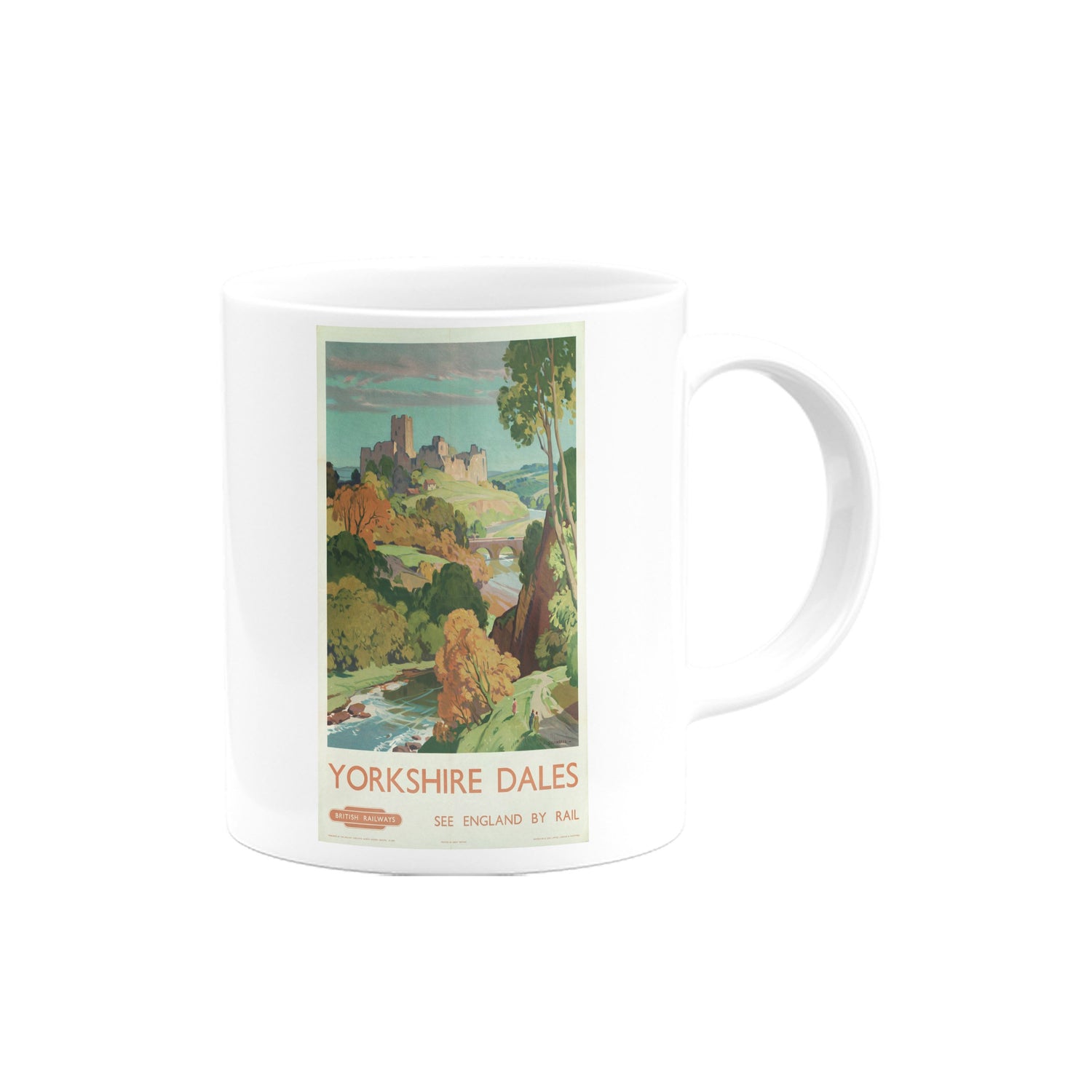 Your favourite Vintage Railway Poster design on a mug. This design of Yorkshire Dales see England by Rail is perfect for a nice cup of tea or coffee. Great as a gift to any Railway Poster enthusiast.
