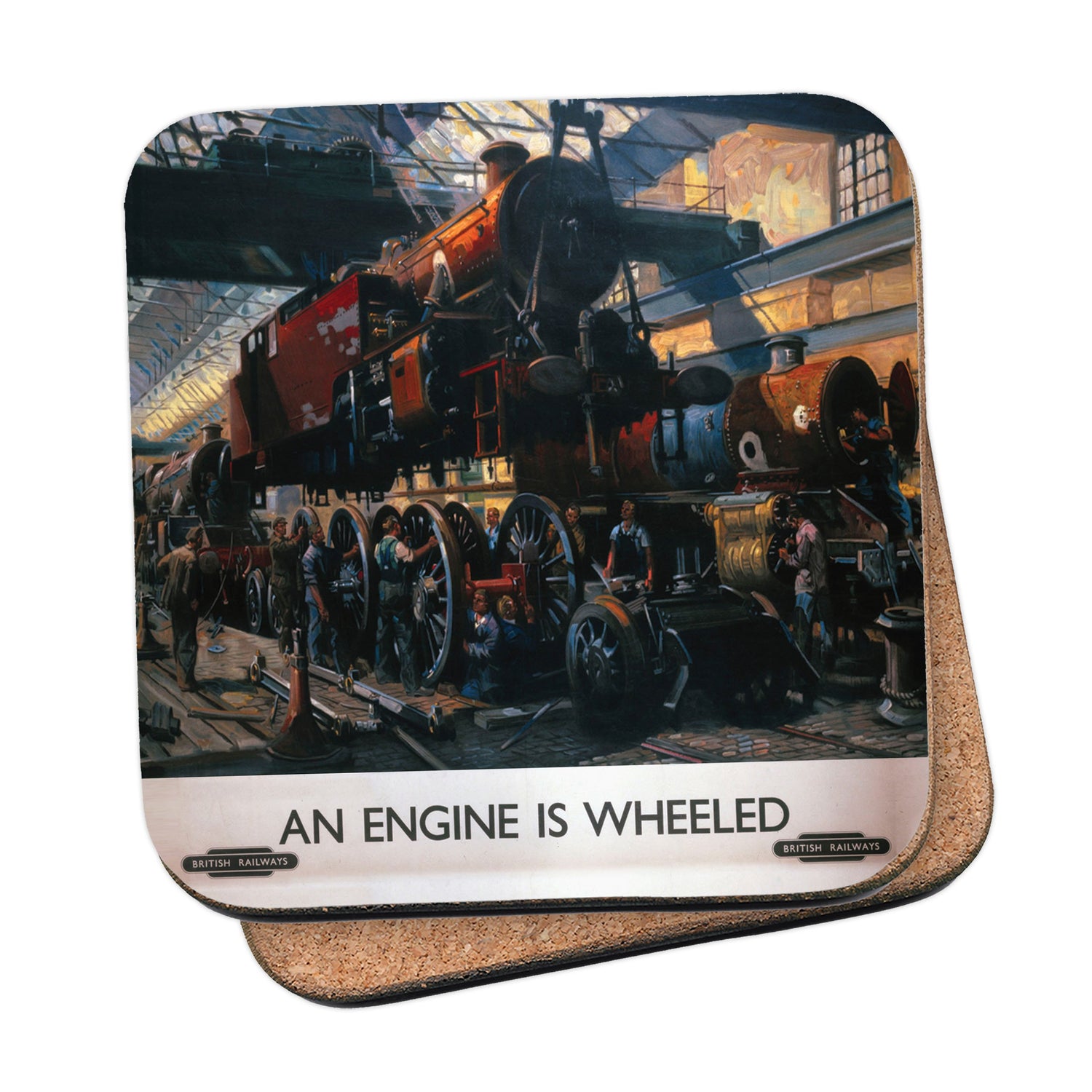 Protect your table surfaces with these durable cork coasters. Beautiful design of Derby Locomotive Works - An Engine is Wheeled. Perfect for any Railway Posters enthusiast.