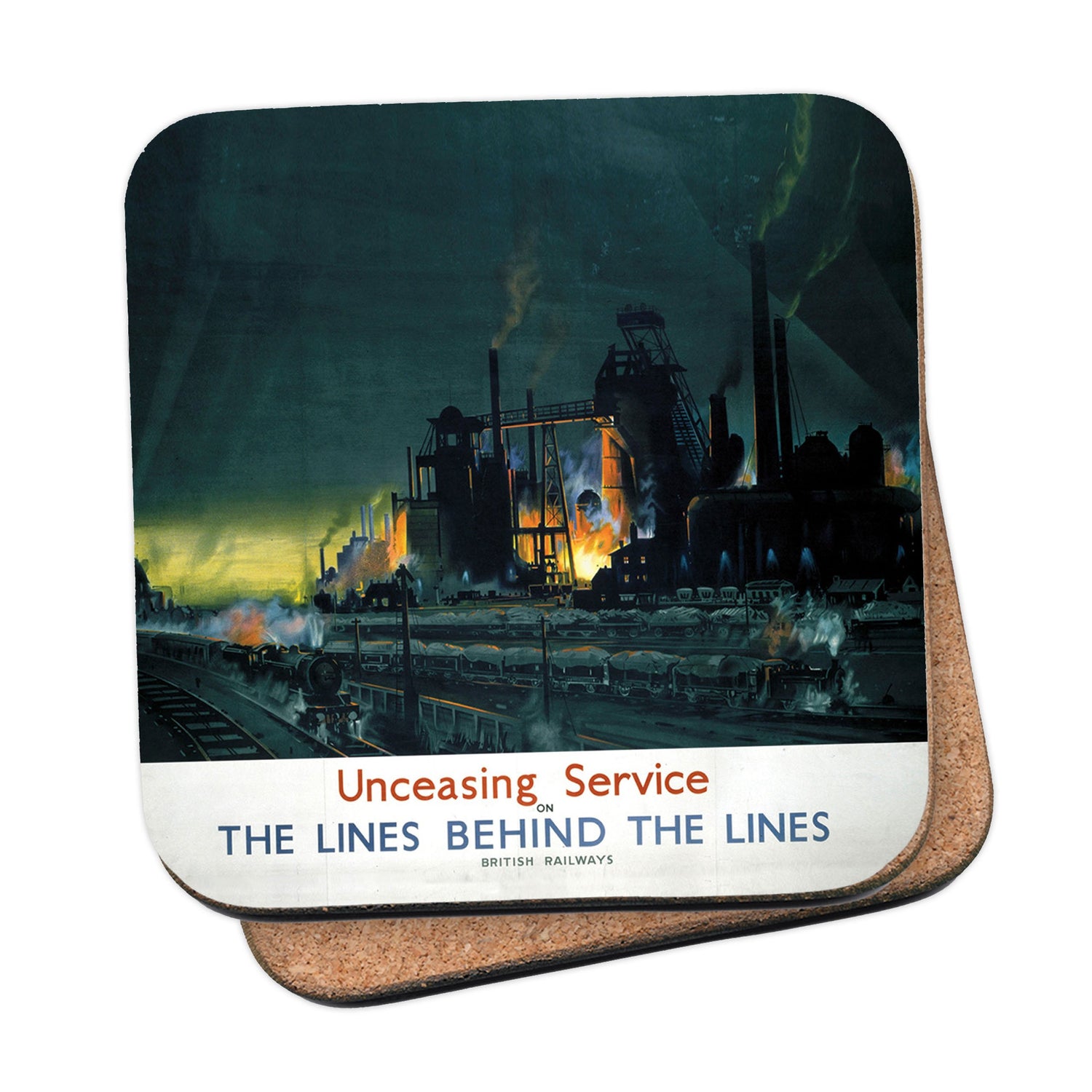 Protect your table surfaces with these durable cork coasters. Beautiful design of Unceasing Service on the Lines behind the lines. Perfect for any Railway Posters enthusiast.