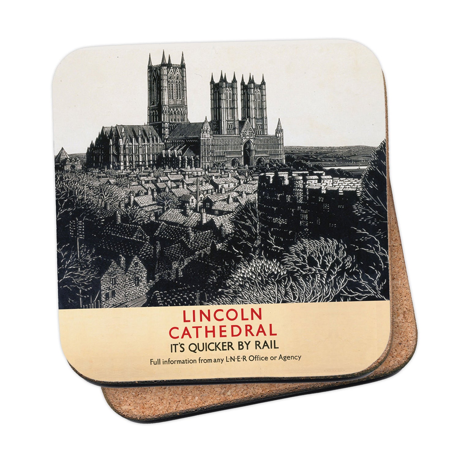 Protect your table surfaces with these durable cork coasters. Beautiful design of Lincoln Cathedral It's Quicker By Rail. Perfect for any Railway Posters enthusiast.