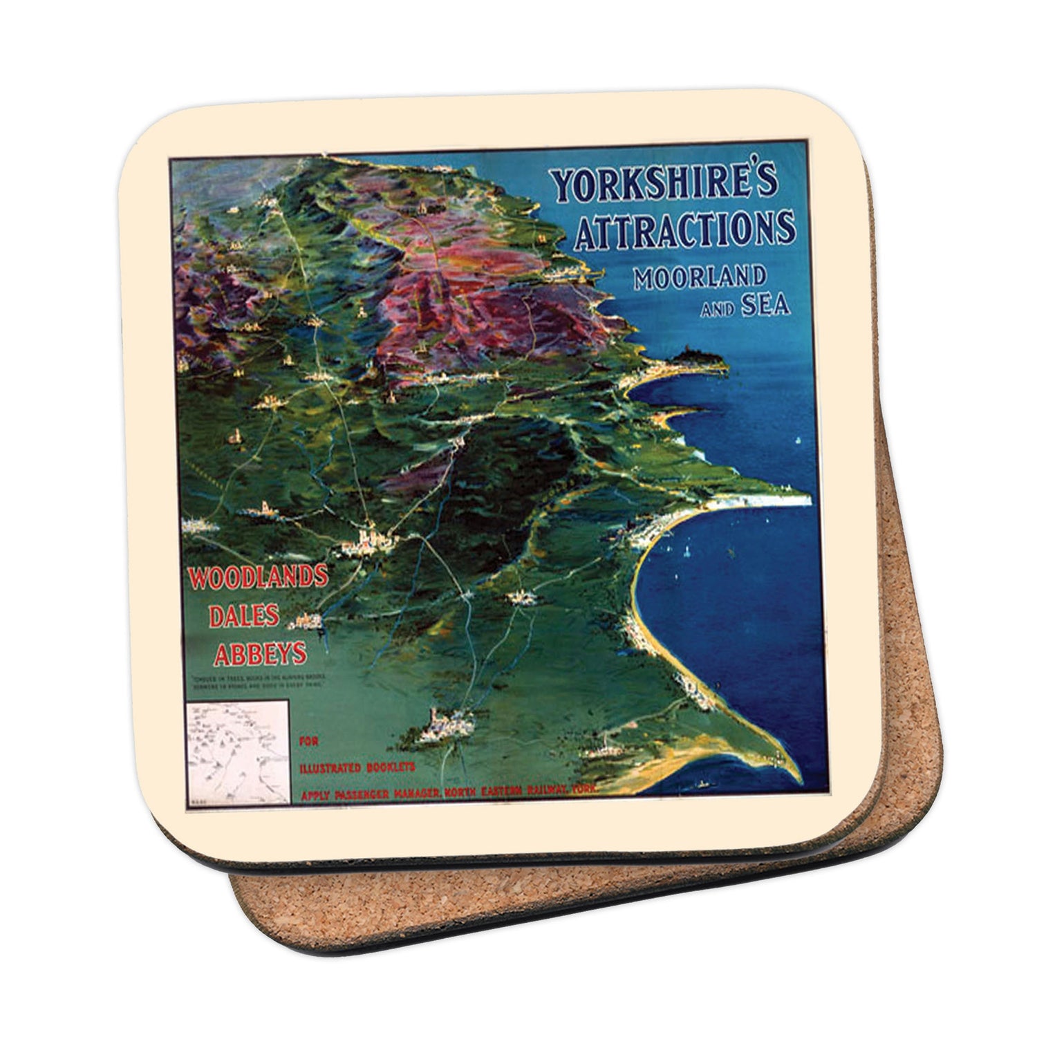 Protect your table surfaces with these durable cork coasters. Beautiful design of Yorkshire's Attractions Moorland and Sea. Perfect for any Railway Posters enthusiast.