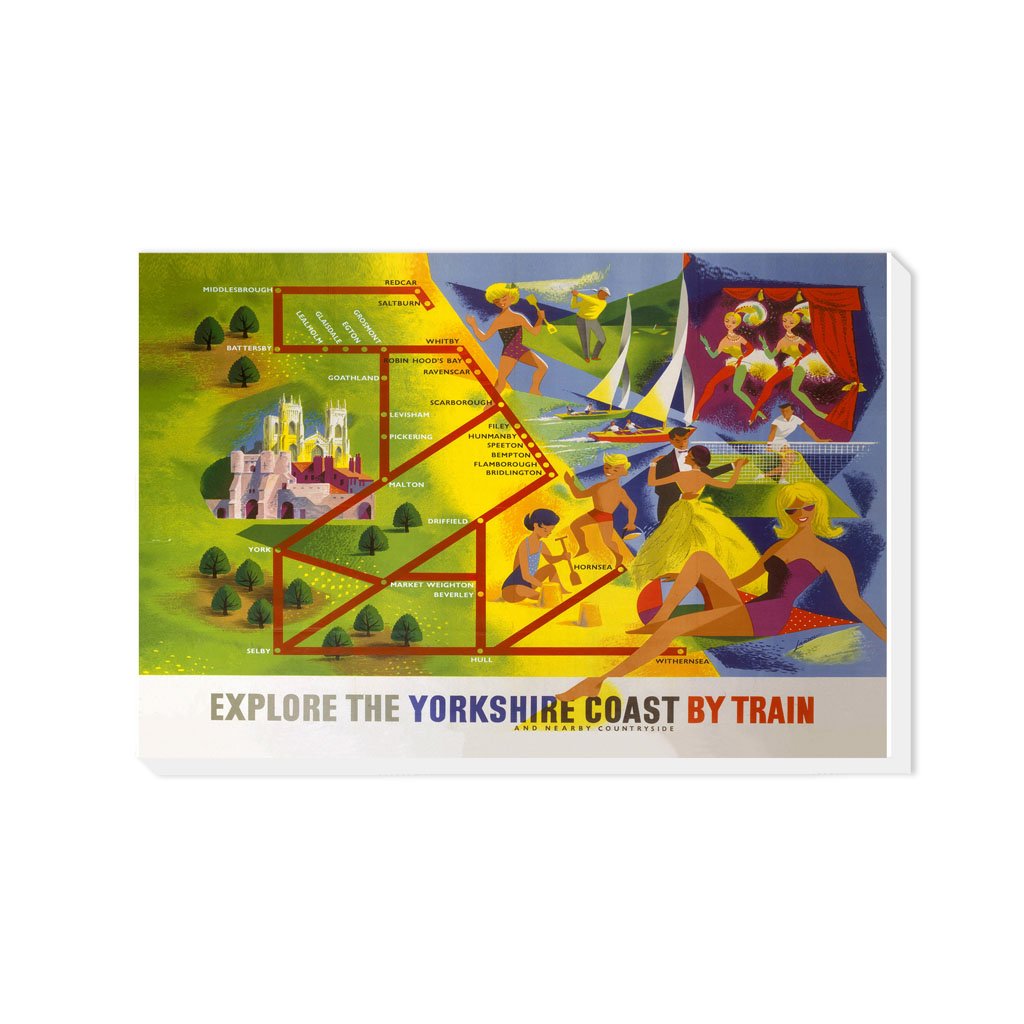 Vintage Railway Poster Canvas Wall Art of Explore the Yorkshire Coast by train. Canvases are available in multiple sizes and are all made from eco-friendly FSC accredited materials. All Railway Poster Canvases are made of the best quality materials and are proudly printed in the UK