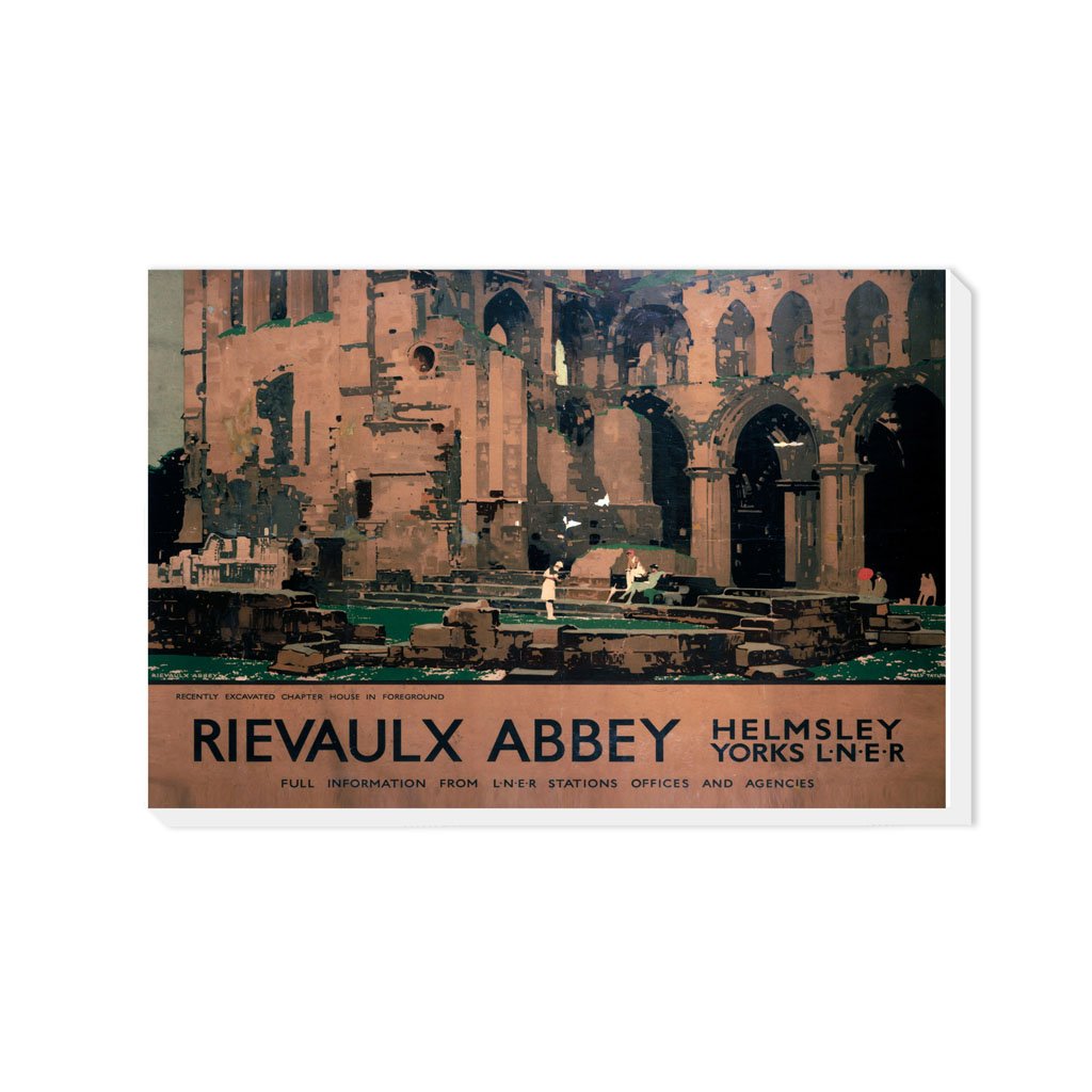 Vintage Railway Poster Canvas Wall Art of Recently Excavated Rievaulx Abbey - Helmsley Station Yorkshire. Canvases are available in multiple sizes and are all made from eco-friendly FSC accredited materials. All Railway Poster Canvases are made of the best quality materials and are proudly printed in the UK