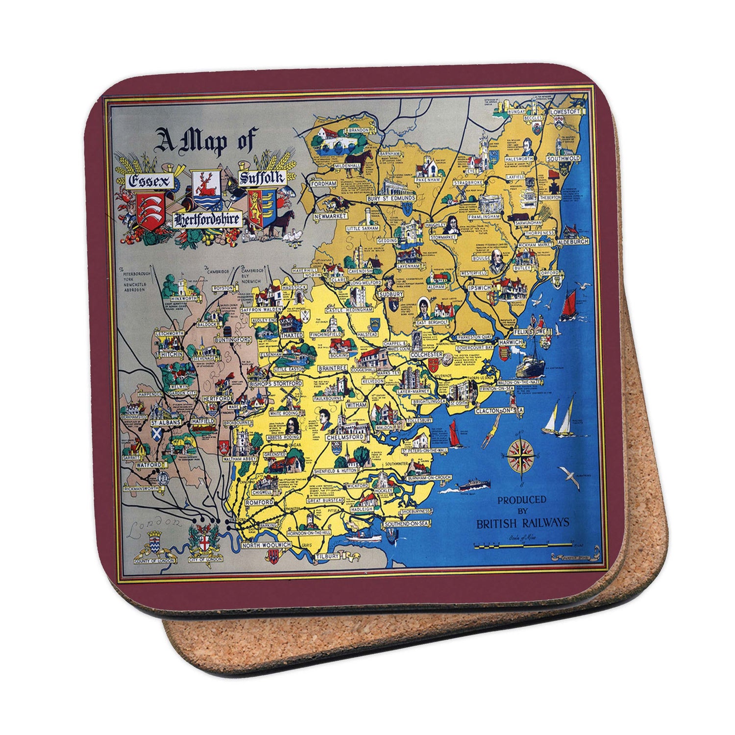 Protect your table surfaces with these durable cork coasters. Beautiful design of A Map of Essex, Suffolk, Hertfordshire. Perfect for any Railway Posters enthusiast.