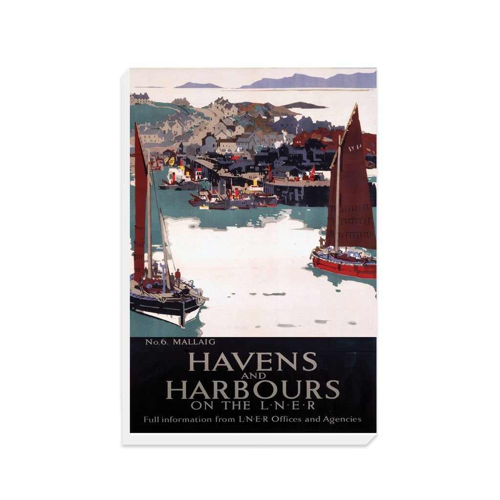 Vintage Railway Poster Canvas Wall Art of Havens and Harbours No 6 Mallaig. Canvases are available in multiple sizes and are all made from eco-friendly FSC accredited materials. All Railway Poster Canvases are made of the best quality materials and are proudly printed in the UK