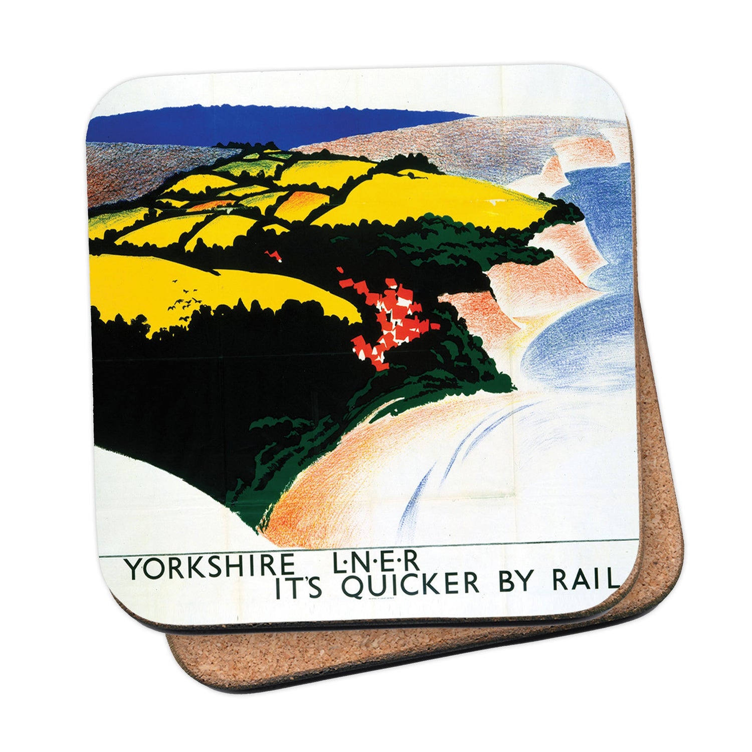 Protect your table surfaces with these durable cork coasters. Beautiful design of Yorkshire, Quicker By Rail. Perfect for any Railway Posters enthusiast.
