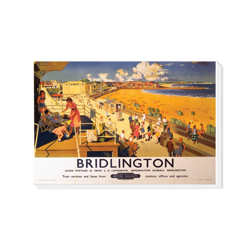 Vintage Railway Poster Canvas Wall Art of Bridlington Beach View - It's Quicker By Rail. Canvases are available in multiple sizes and are all made from eco-friendly FSC accredited materials. All Railway Poster Canvases are made of the best quality materials and are proudly printed in the UK