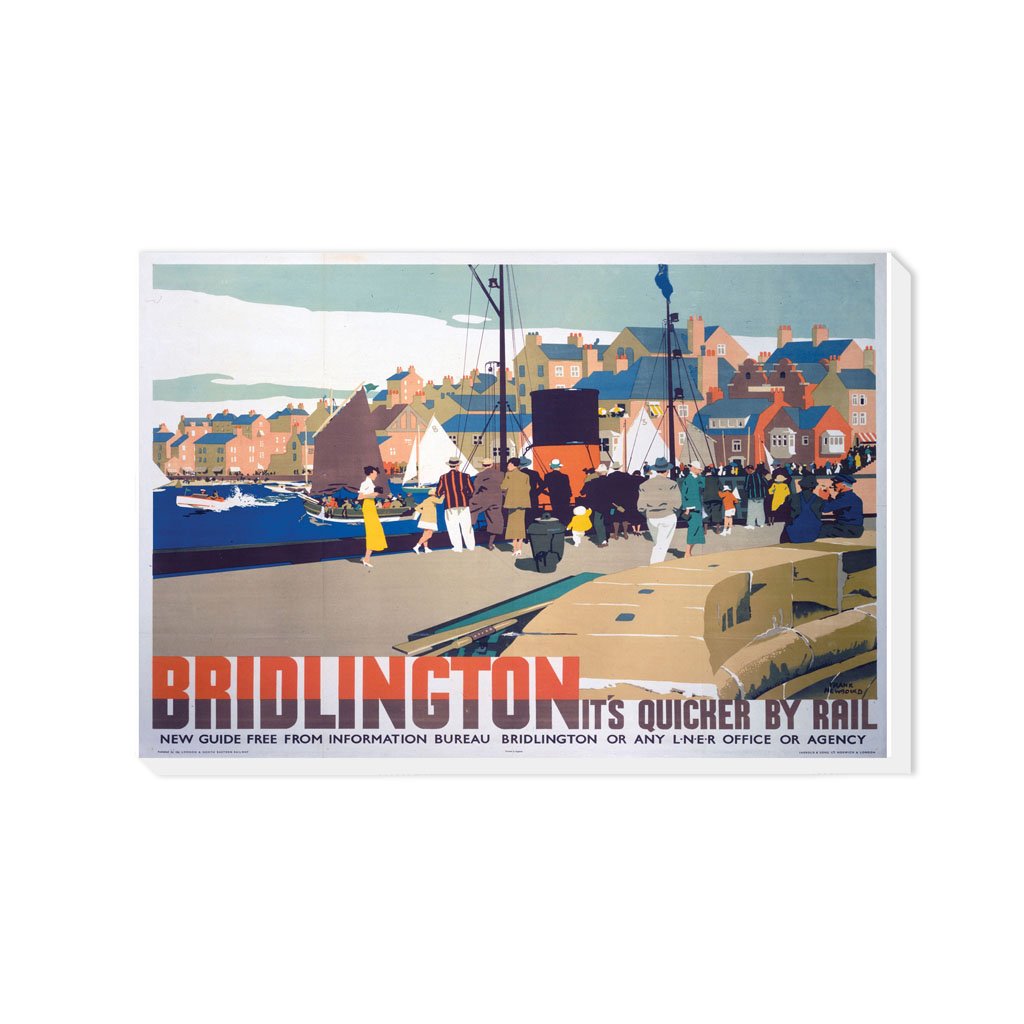 Vintage Railway Poster Canvas Wall Art of Bridlington Busy Docks - It's Quicker By Rail. Canvases are available in multiple sizes and are all made from eco-friendly FSC accredited materials. All Railway Poster Canvases are made of the best quality materials and are proudly printed in the UK