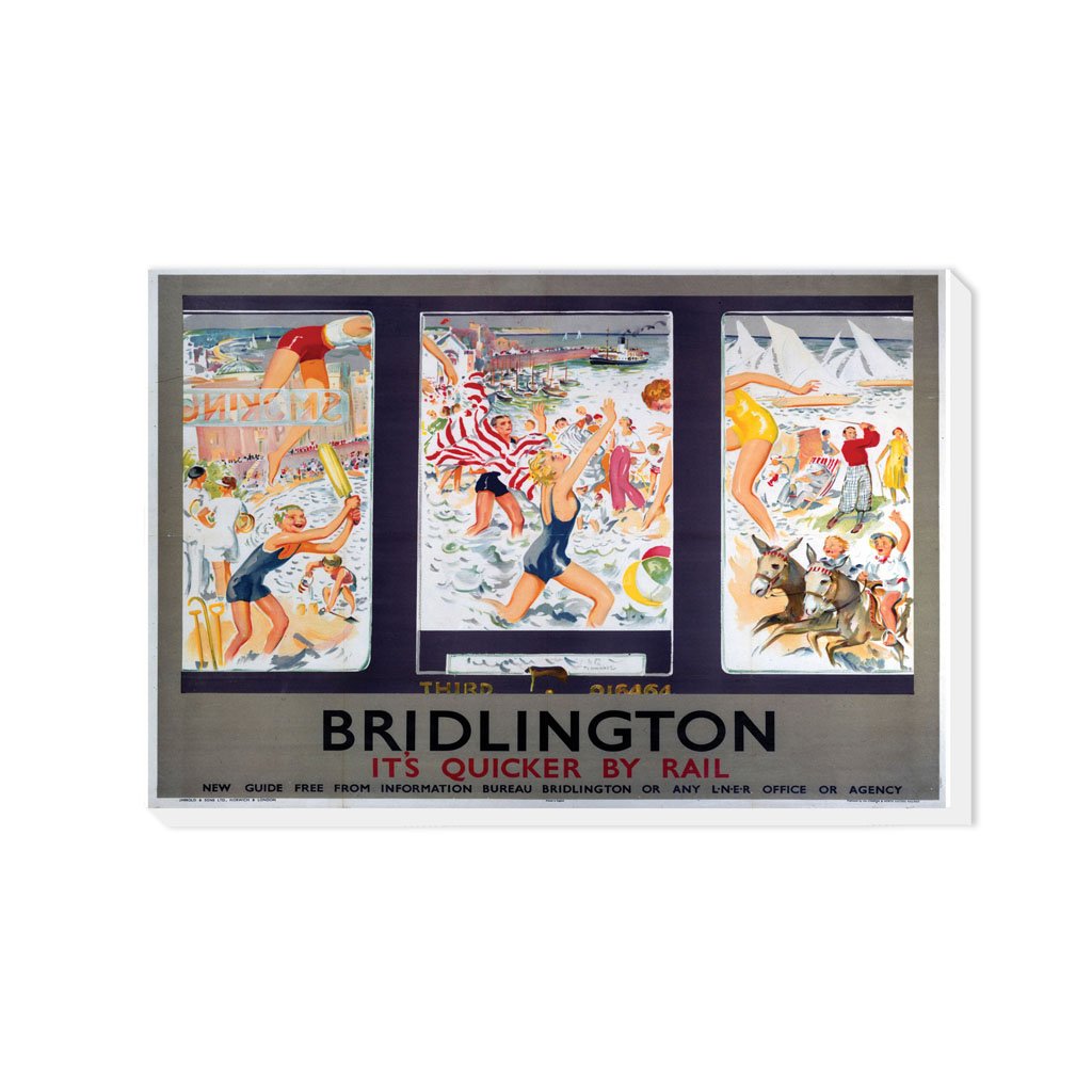 Vintage Railway Poster Canvas Wall Art of Bridlington Busy Beach - It's Quicker By Rail. Canvases are available in multiple sizes and are all made from eco-friendly FSC accredited materials. All Railway Poster Canvases are made of the best quality materials and are proudly printed in the UK