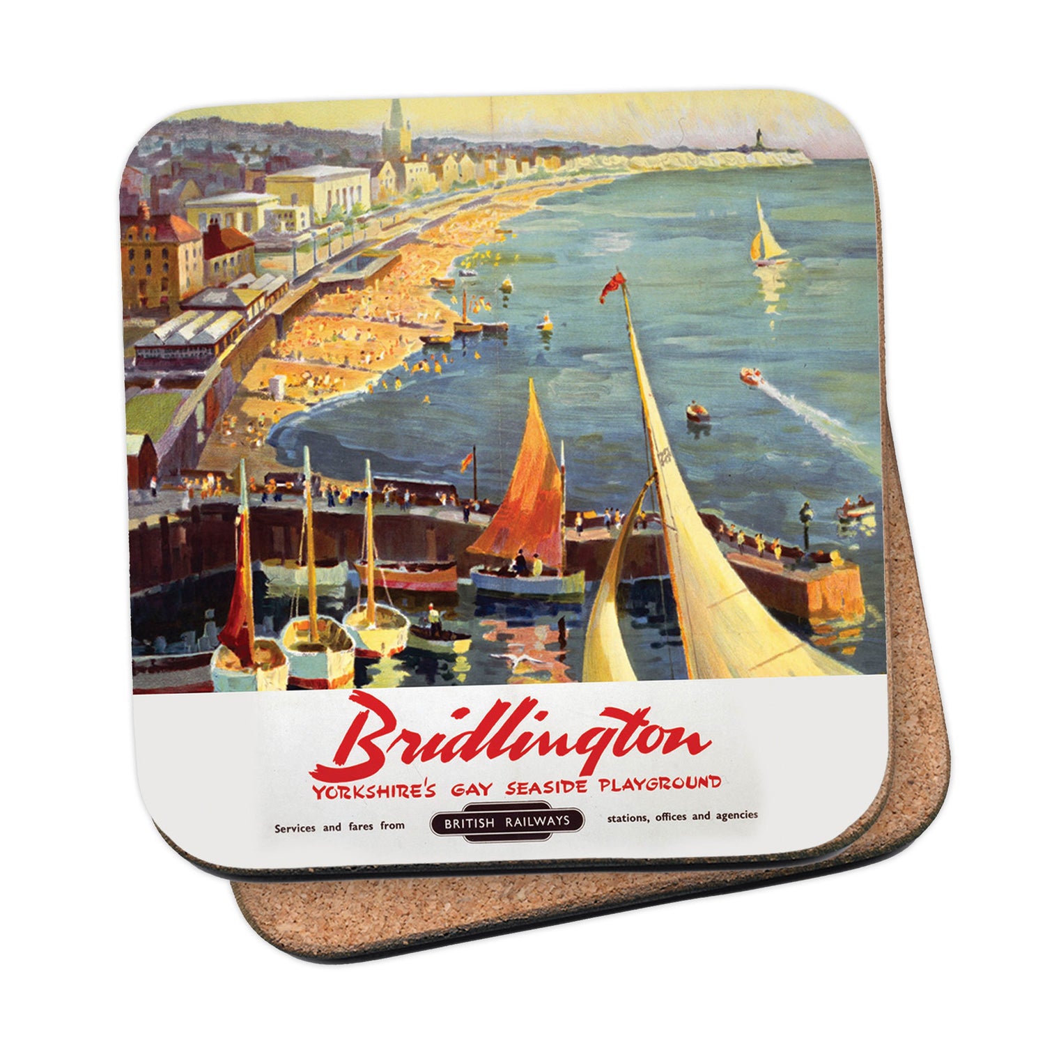 Protect your table surfaces with these durable cork coasters. Beautiful design of Bridlington, Yorkshire's Gay Seaside playground. Perfect for any Railway Posters enthusiast.