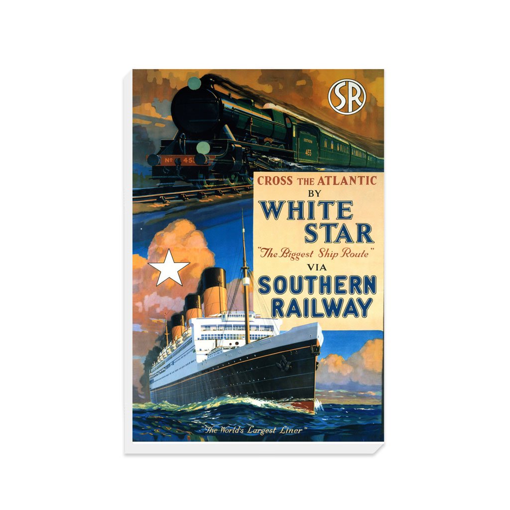 Vintage Railway Poster Canvas Wall Art of Cross the Atlantic by White Star - Southern Railway. Canvases are available in multiple sizes and are all made from eco-friendly FSC accredited materials. All Railway Poster Canvases are made of the best quality materials and are proudly printed in the UK