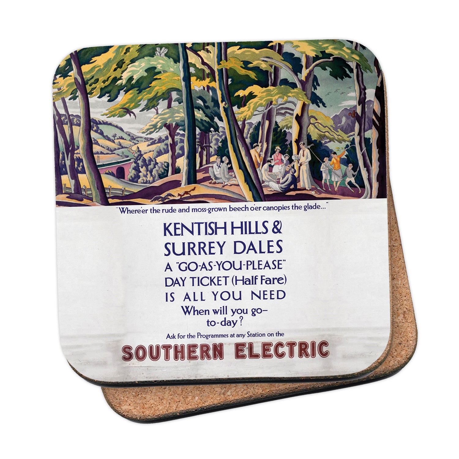 Protect your table surfaces with these durable cork coasters. Beautiful design of Kentish Hills and Surrey Dales. Perfect for any Railway Posters enthusiast.