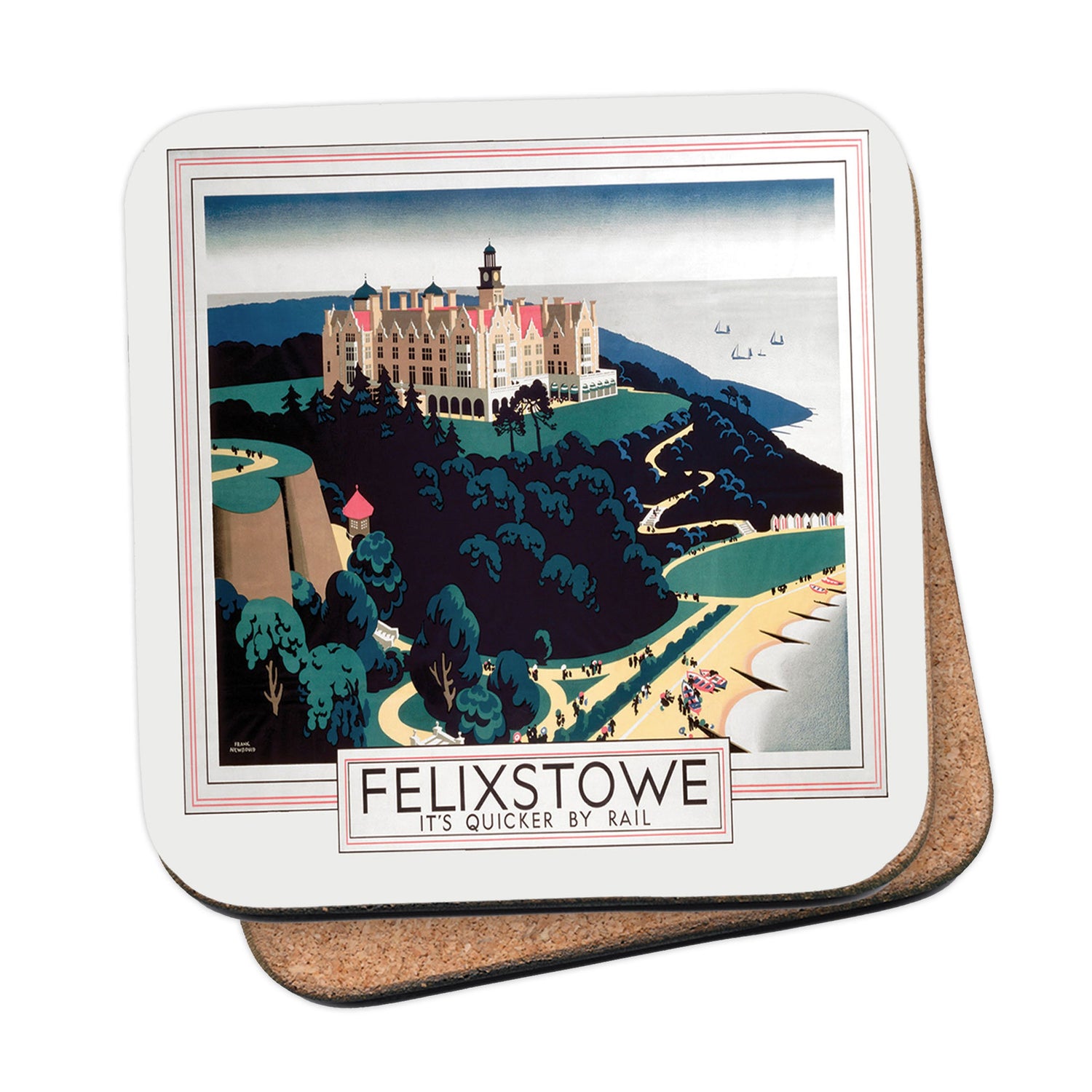Protect your table surfaces with these durable cork coasters. Beautiful design of Felixstowe, It's Quicker By Rail. Perfect for any Railway Posters enthusiast.
