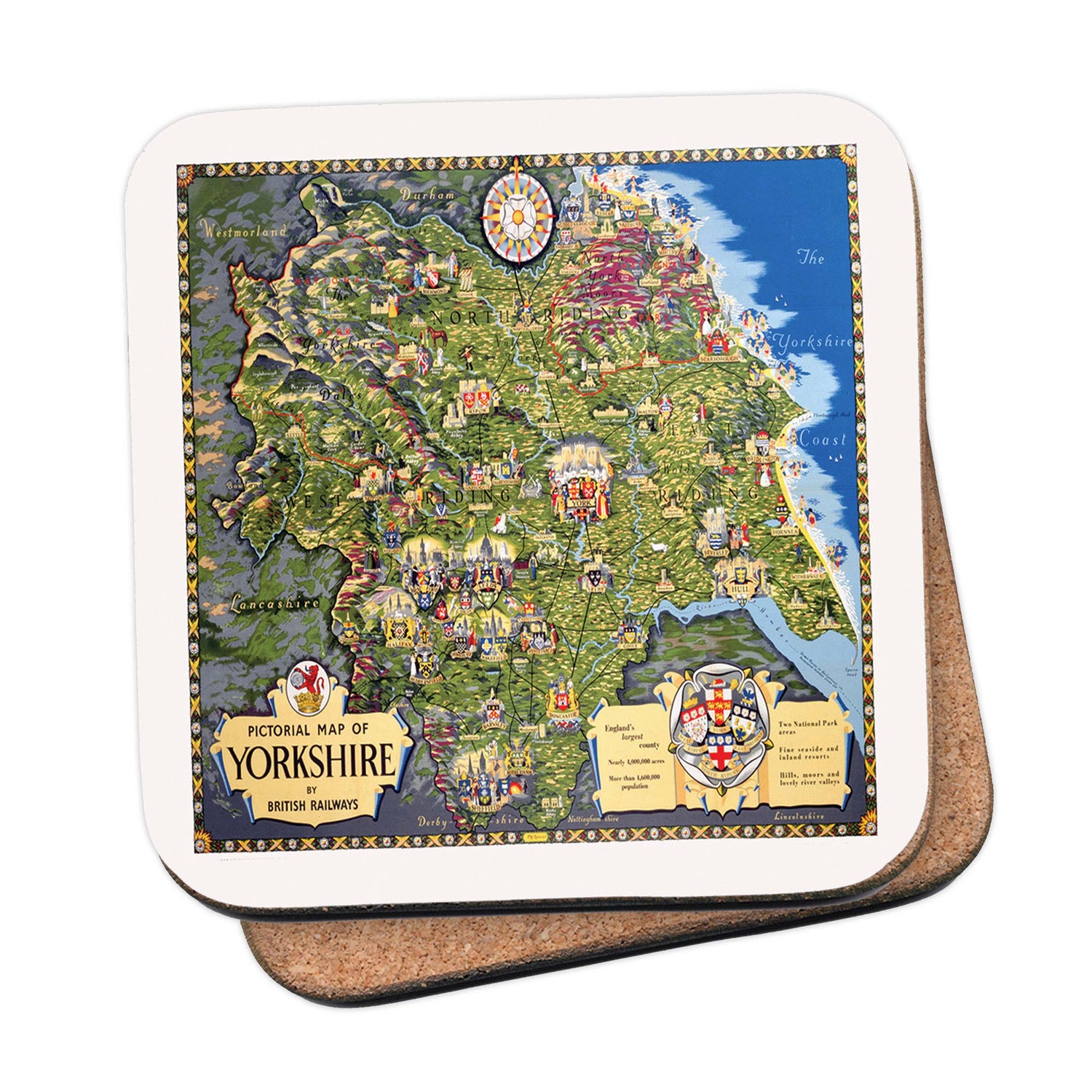 Protect your table surfaces with these durable cork coasters. Beautiful design of Pictorial Map of Yorkshire. Perfect for any Railway Posters enthusiast.