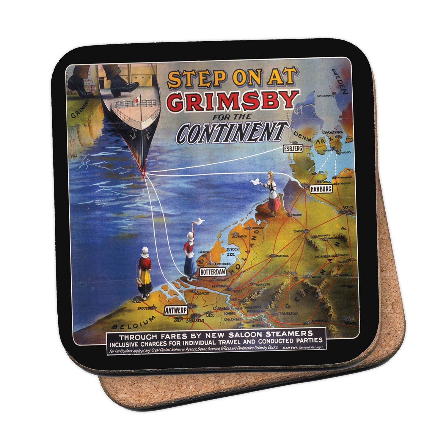 Protect your table surfaces with these durable cork coasters. Beautiful design of Step on at Grimsby for the Continent. Perfect for any Railway Posters enthusiast.