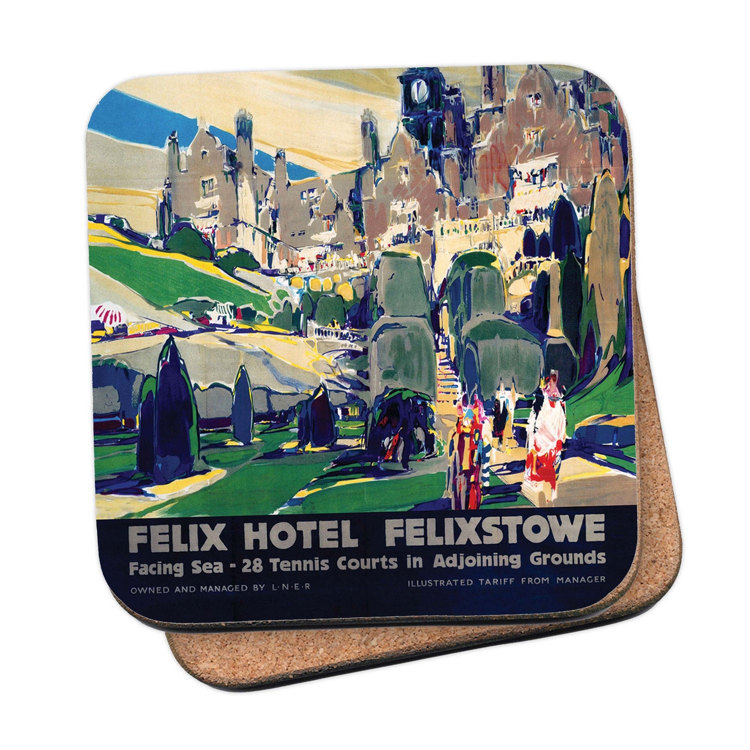 Protect your table surfaces with these durable cork coasters. Beautiful design of Felix Hotel, Felixstowe. Perfect for any Railway Posters enthusiast.