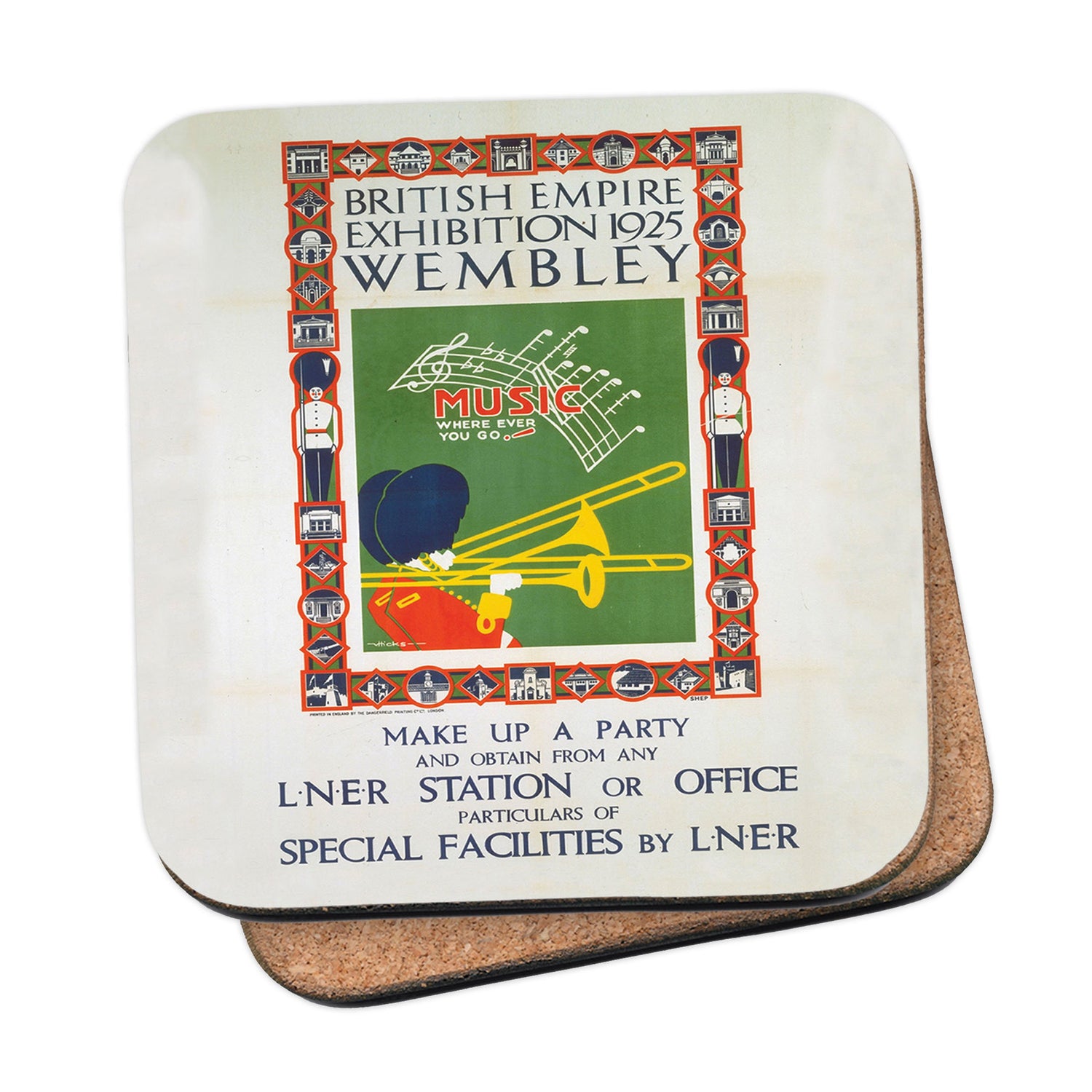 Protect your table surfaces with these durable cork coasters. Beautiful design of British Empire Exhibition, 1925 Wembley. Perfect for any Railway Posters enthusiast.