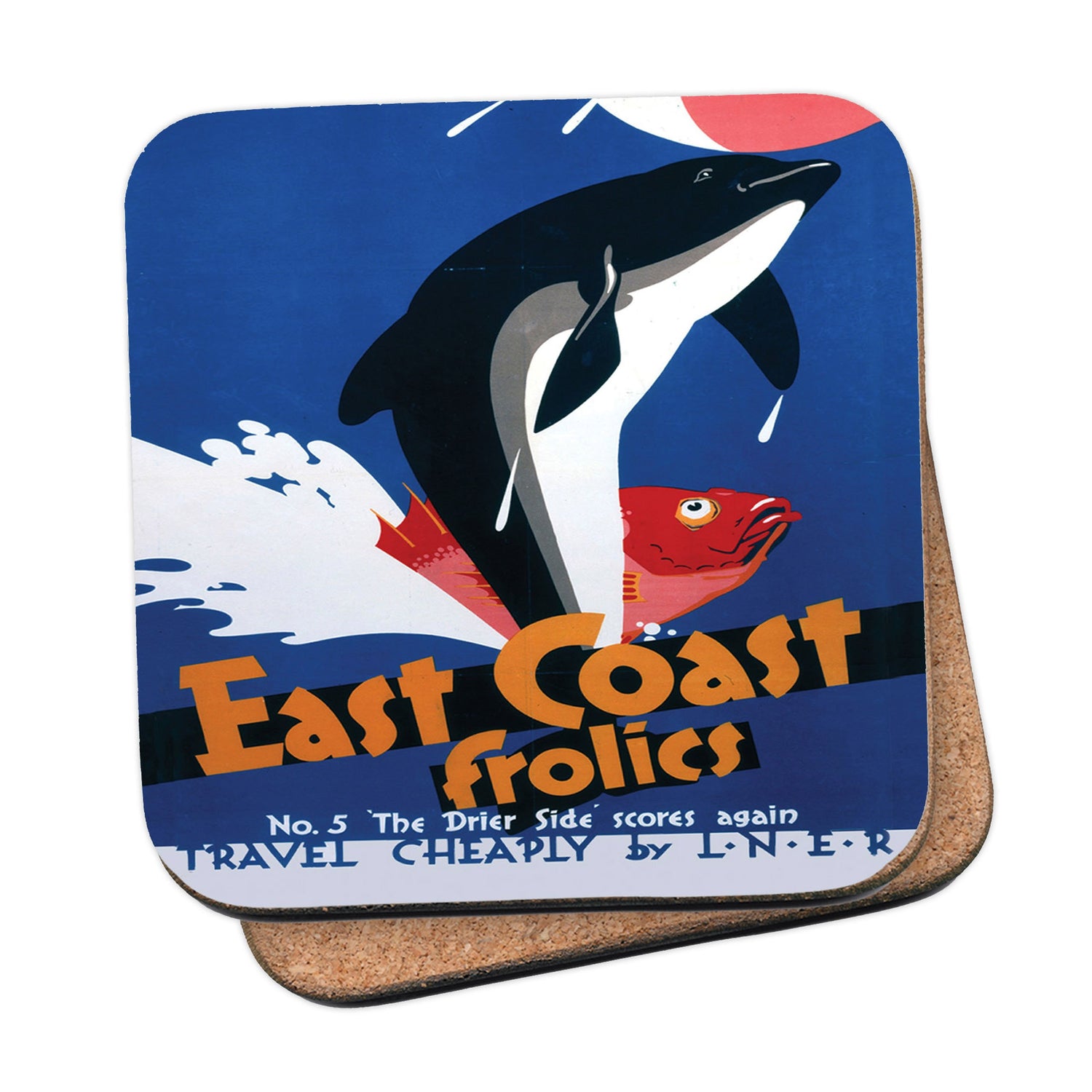 Protect your table surfaces with these durable cork coasters. Beautiful design of East Coast Frolics No 5. Perfect for any Railway Posters enthusiast.