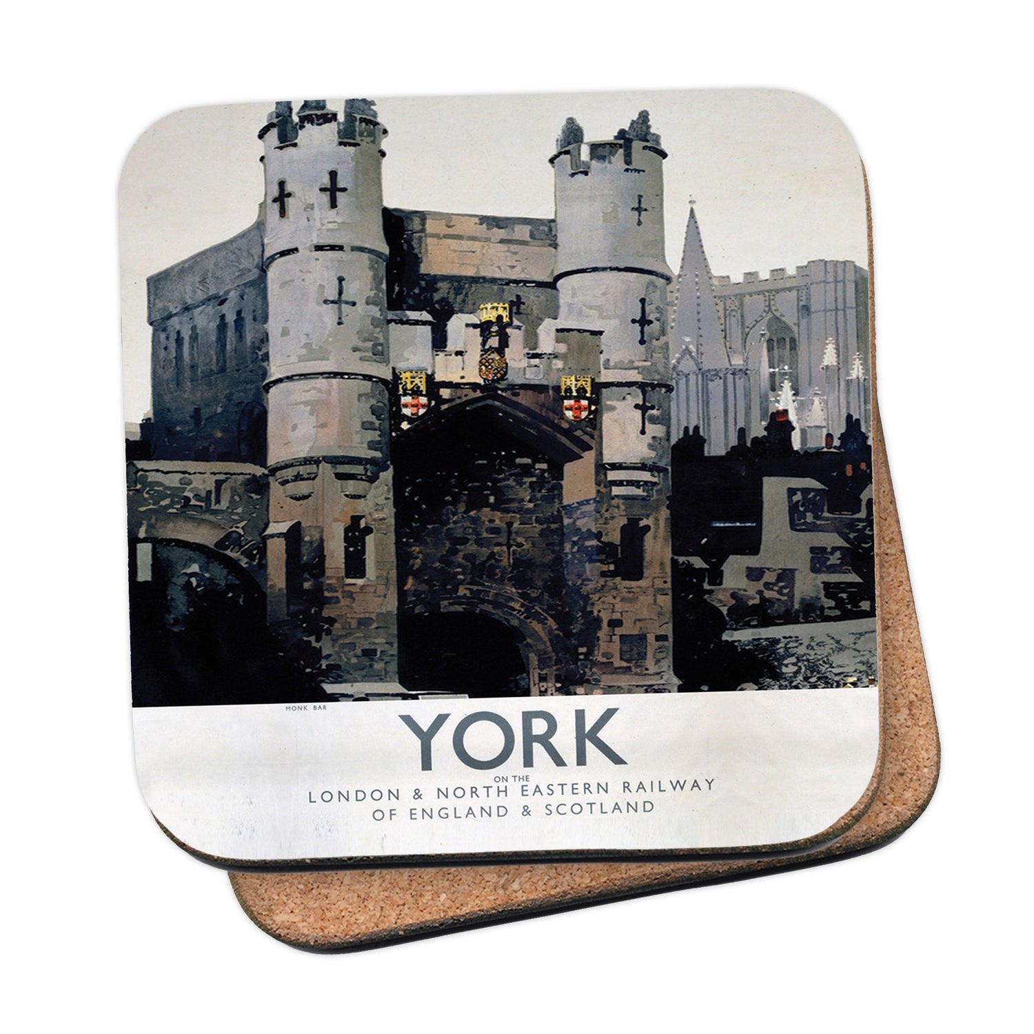 Protect your table surfaces with these durable cork coasters. Beautiful design of York, Monk Bar. Perfect for any Railway Posters enthusiast.