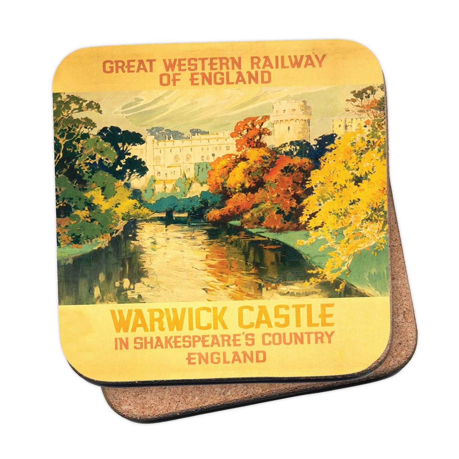 Protect your table surfaces with these durable cork coasters. Beautiful design of Warwick Castle - Shakespeare's Country. Perfect for any Railway Posters enthusiast.