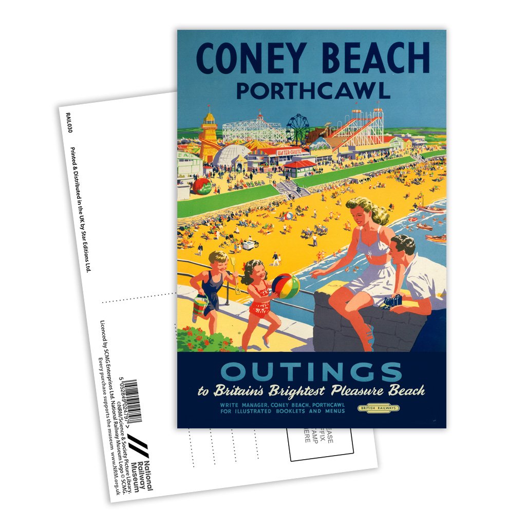 This Vintage Railway Poster postcard pack contains eight postcards. Each printed with the classic poster design of Coney Beach Porthcawl - Outings to Britain's Brightest Pleasure Beach. All Railway Poster postcards are made from sustainable materials and is FSC accredited.